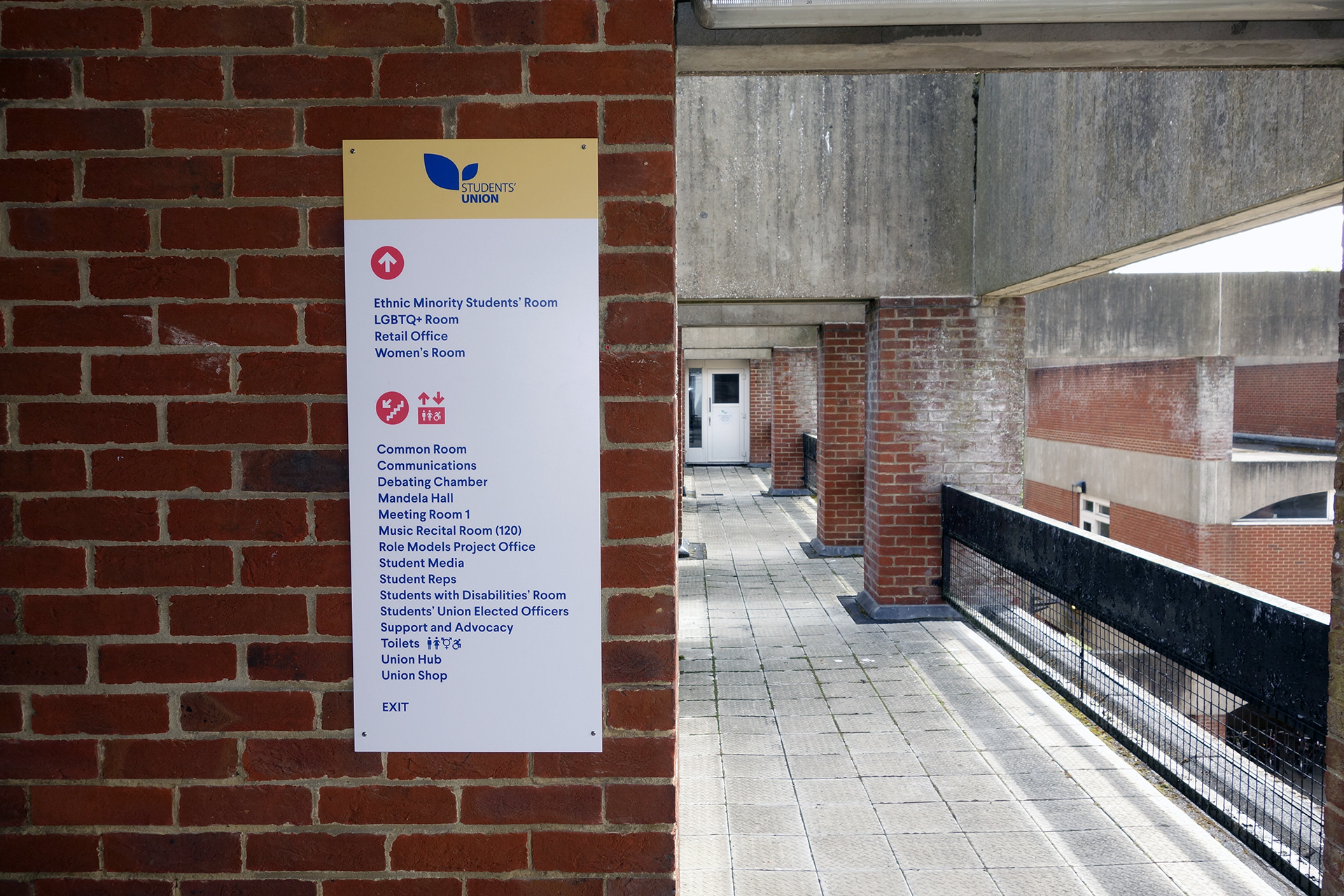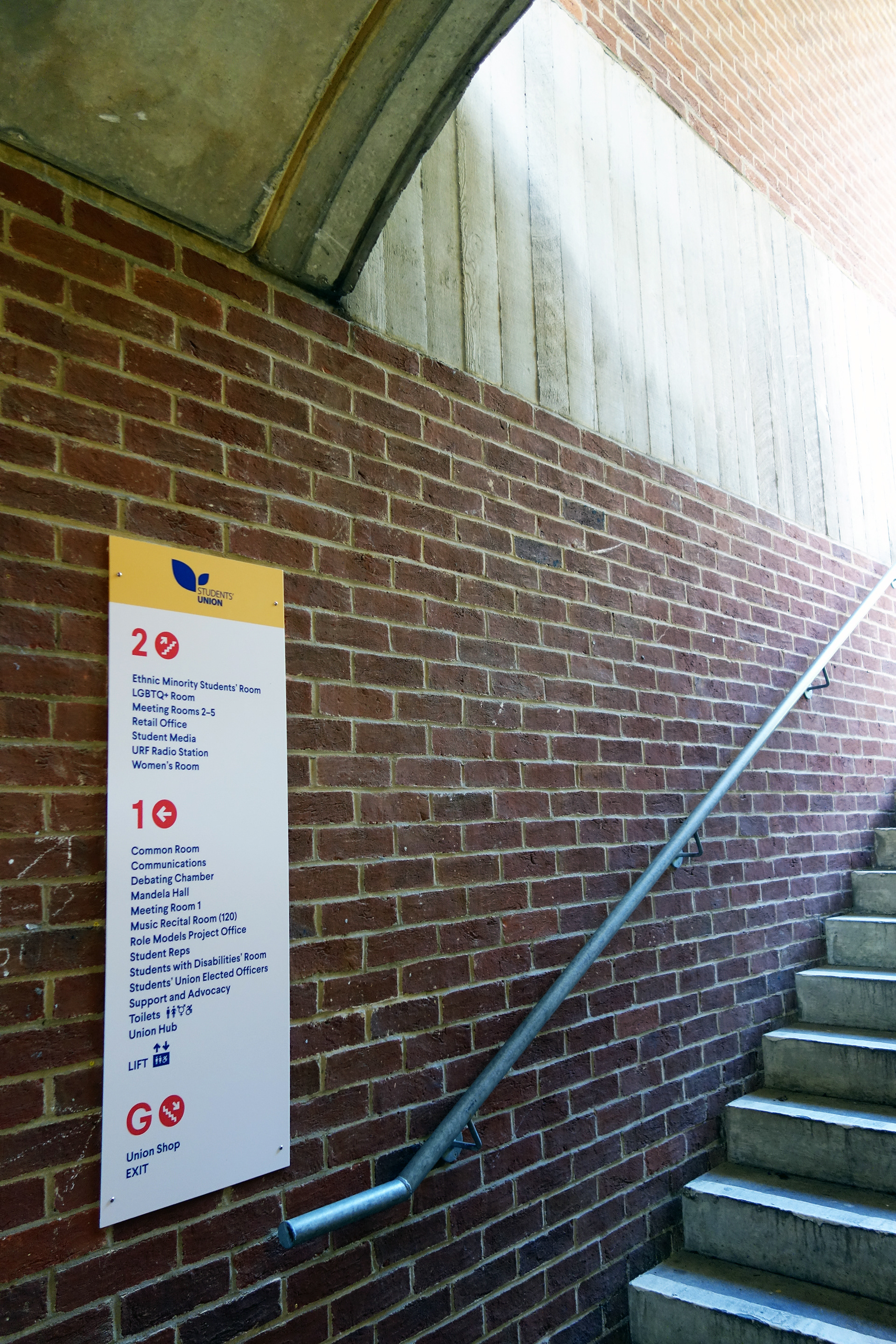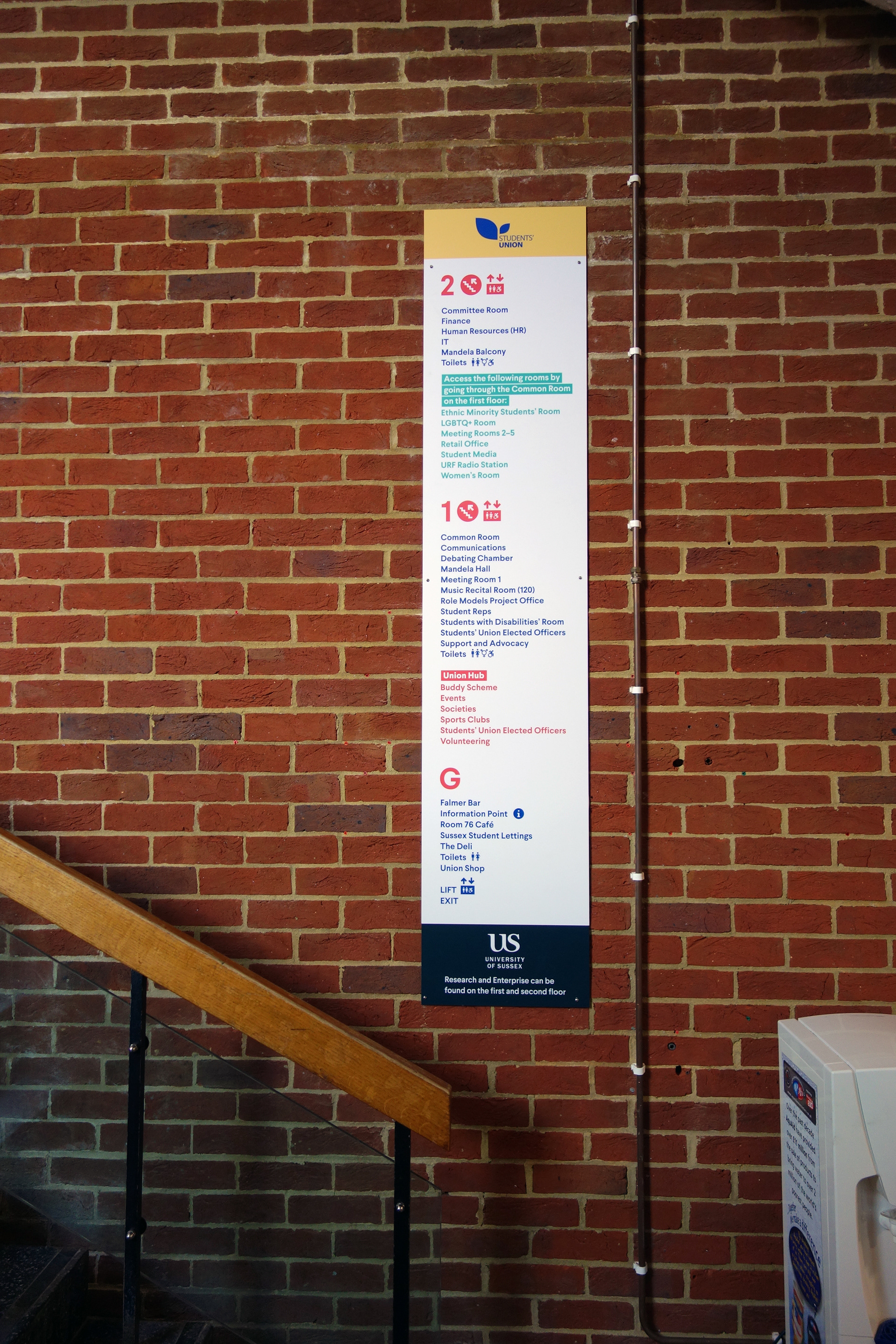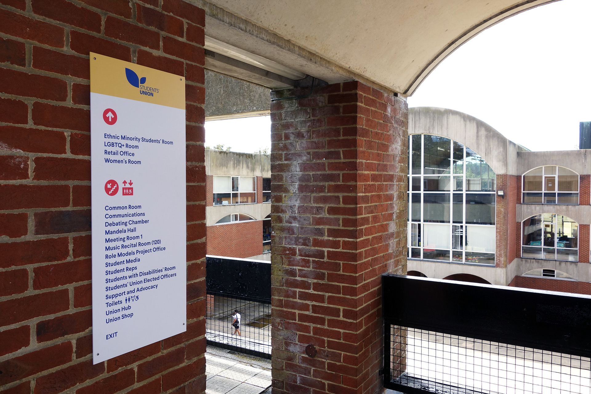 Falmer House is a significant building located on the campus grounds at The University of Sussex. Designed by Basil Spence and an exemplar example of modern Brutalist architecture, the building was been awarded Grade 1 status in 1993 being of ‘exceptional interest’. Commissioned by the Students Union to create new wayfinding and signage around the building that adhered to their new identity, the project required listed building sensitivities and the need to clearly direct and inform students, staff and visitors around a fairly complex building. Fabrication and installation by Standard 8.
