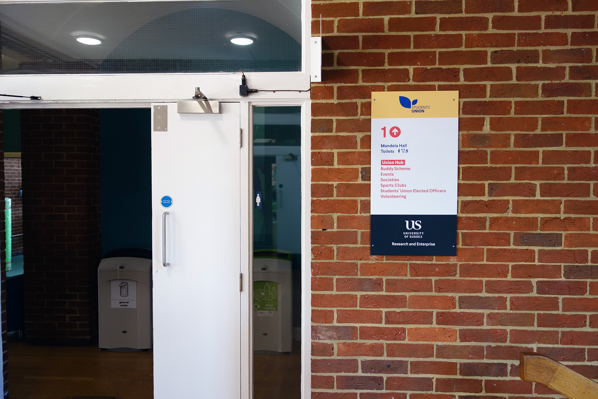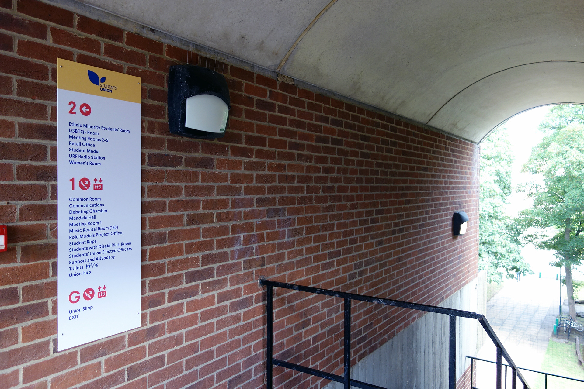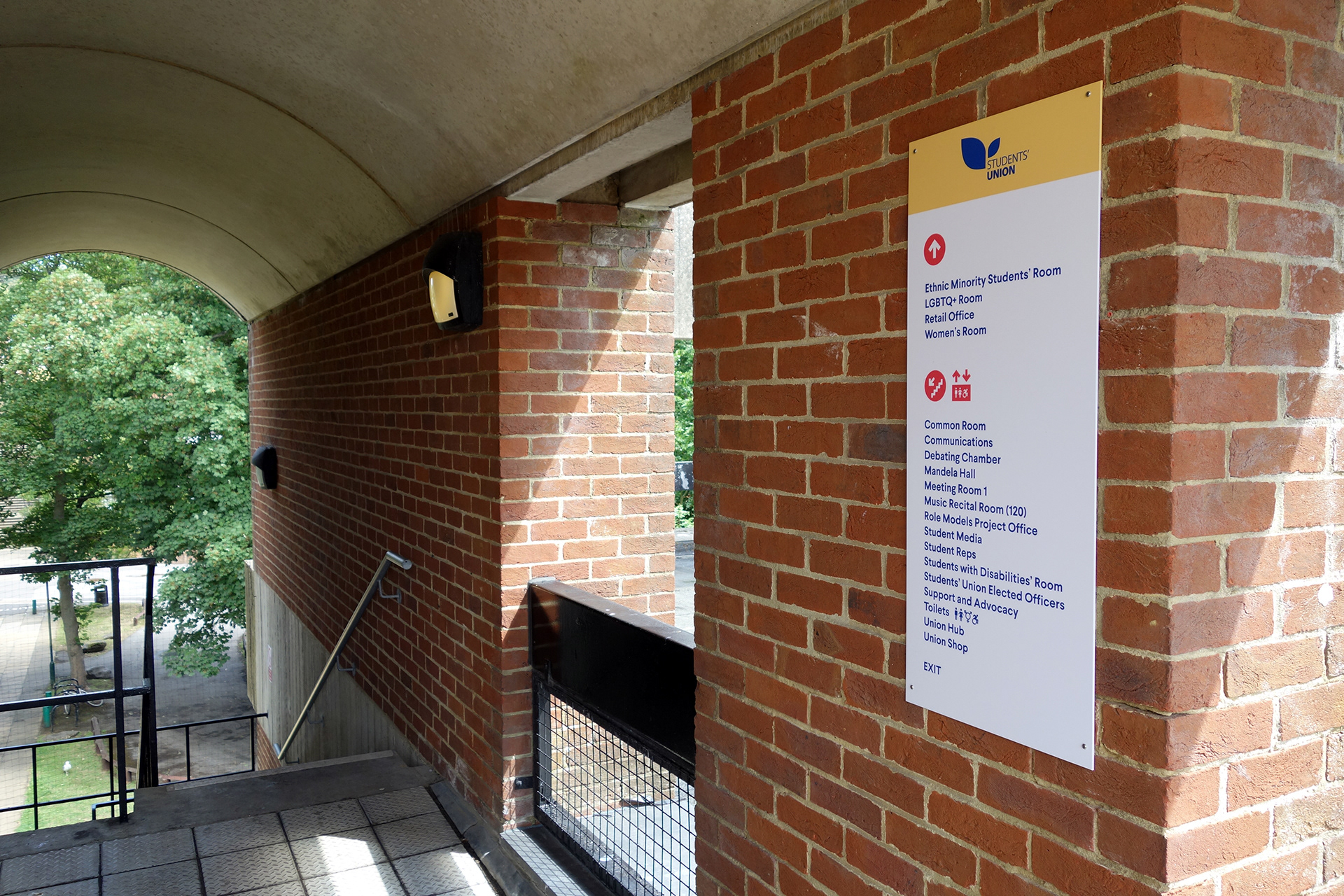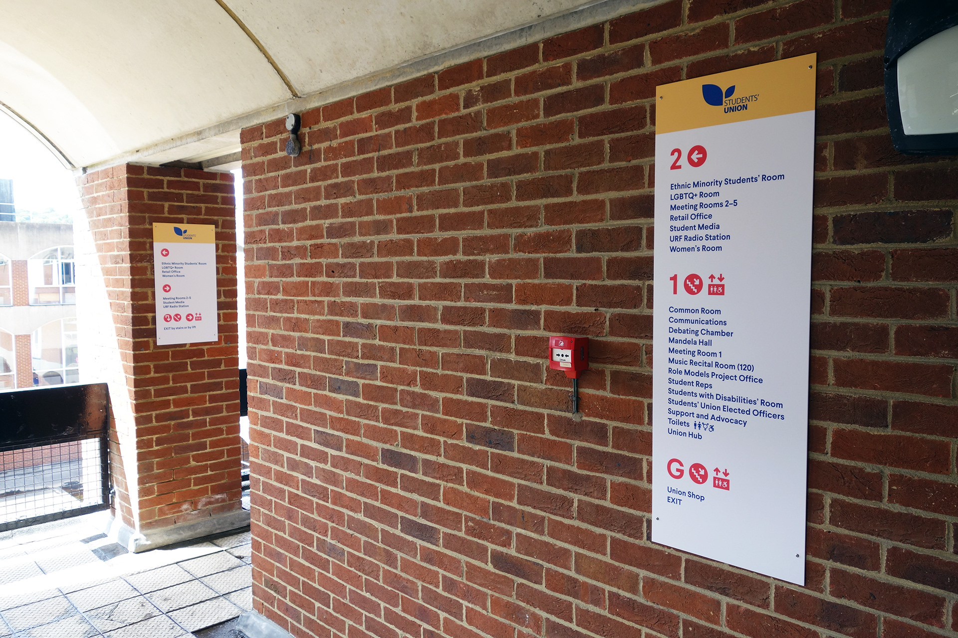 Falmer House is a significant building located on the campus grounds at The University of Sussex. Designed by Basil Spence and an exemplar example of modern Brutalist architecture, the building was been awarded Grade 1 status in 1993 being of ‘exceptional interest’. Commissioned by the Students Union to create new wayfinding and signage around the building that adhered to their new identity, the project required listed building sensitivities and the need to clearly direct and inform students, staff and visitors around a fairly complex building. Fabrication and installation by Standard 8.