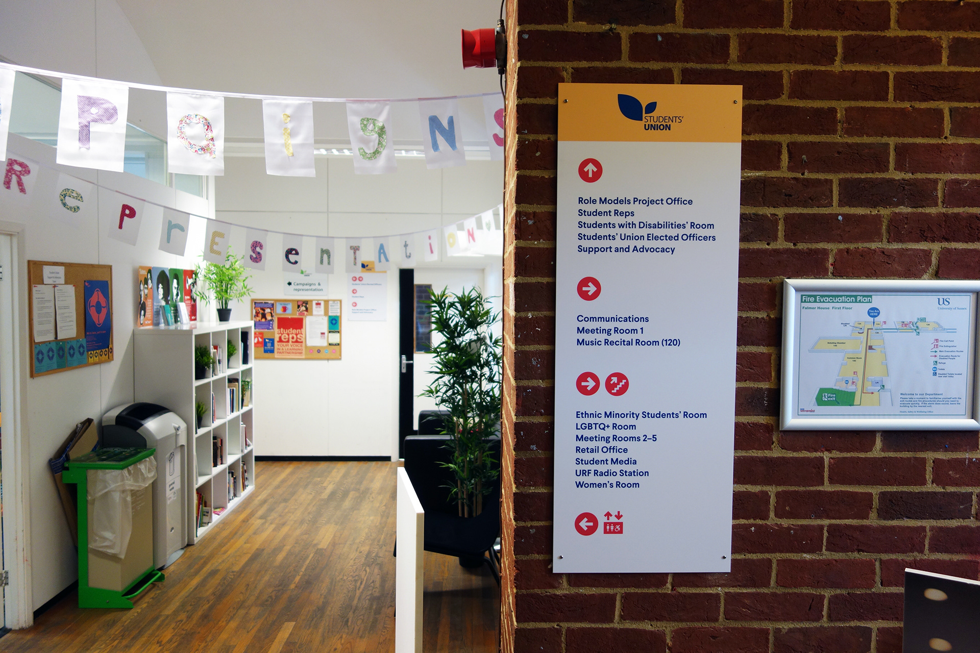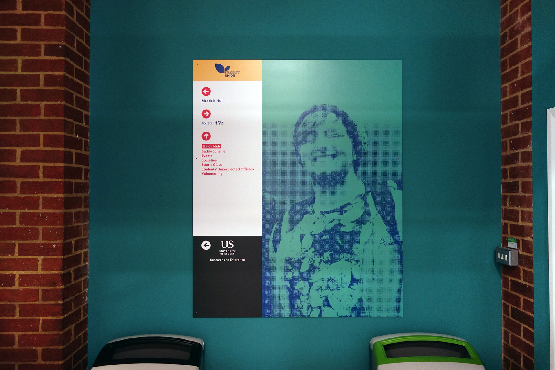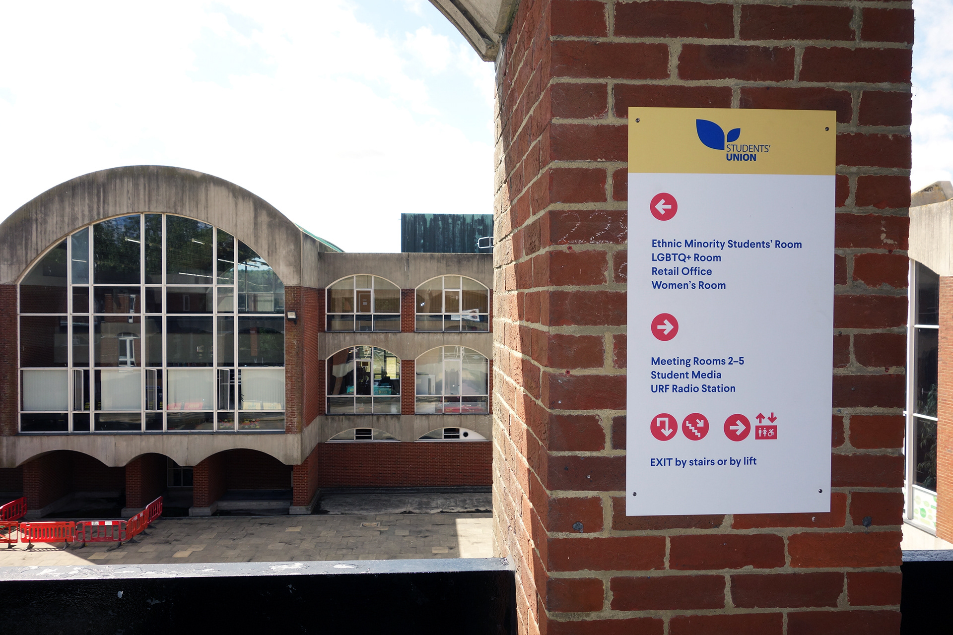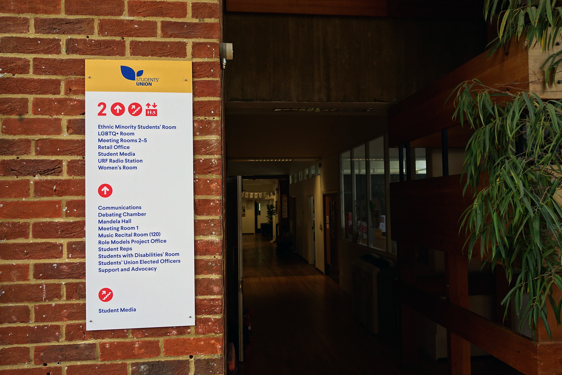 Falmer House is a significant building located on the campus grounds at The University of Sussex. Designed by Basil Spence and an exemplar example of modern Brutalist architecture, the building was been awarded Grade 1 status in 1993 being of ‘exceptional interest’. Commissioned by the Students Union to create new wayfinding and signage around the building that adhered to their new identity, the project required listed building sensitivities and the need to clearly direct and inform students, staff and visitors around a fairly complex building. Fabrication and installation by Standard 8.
