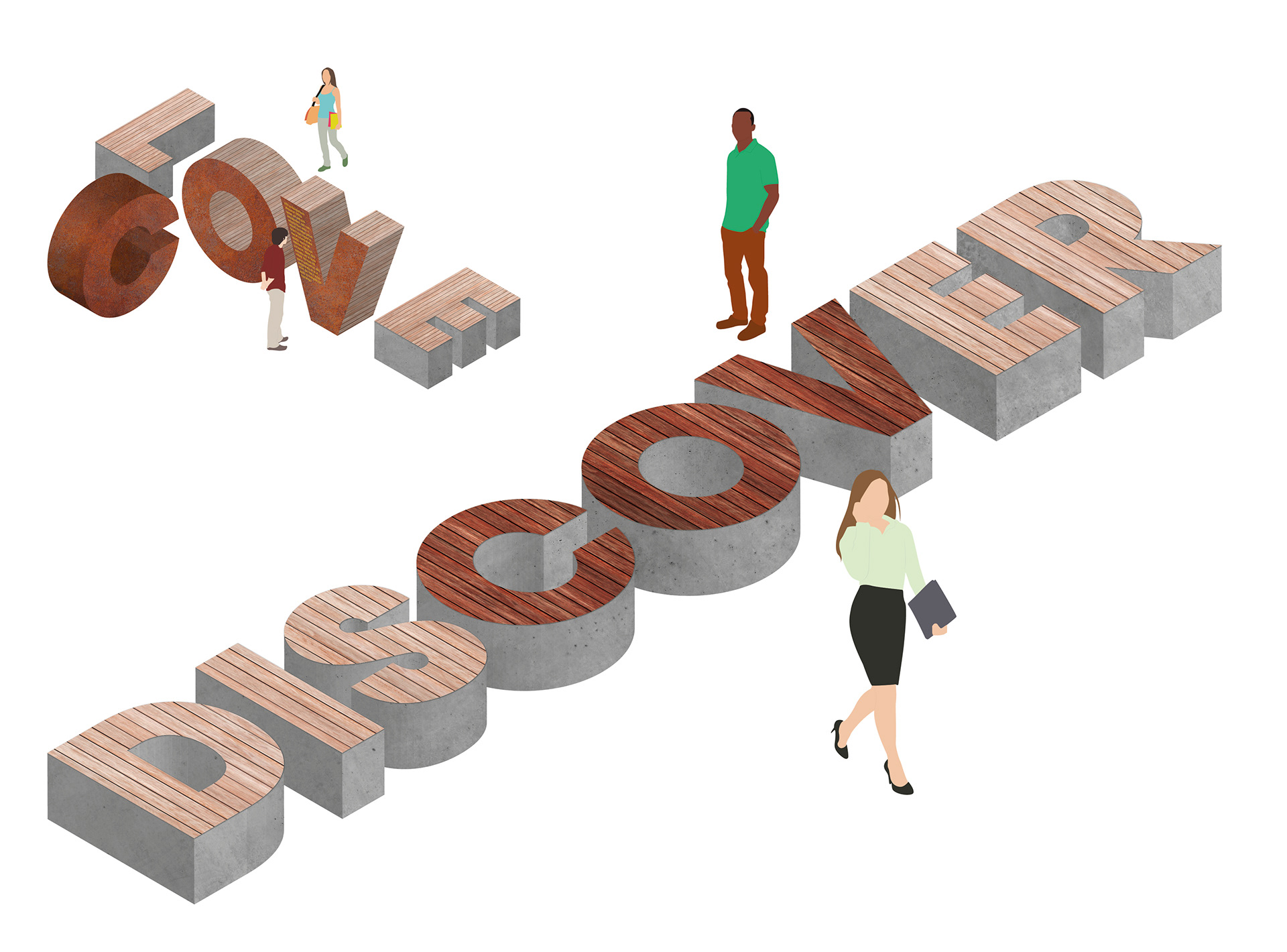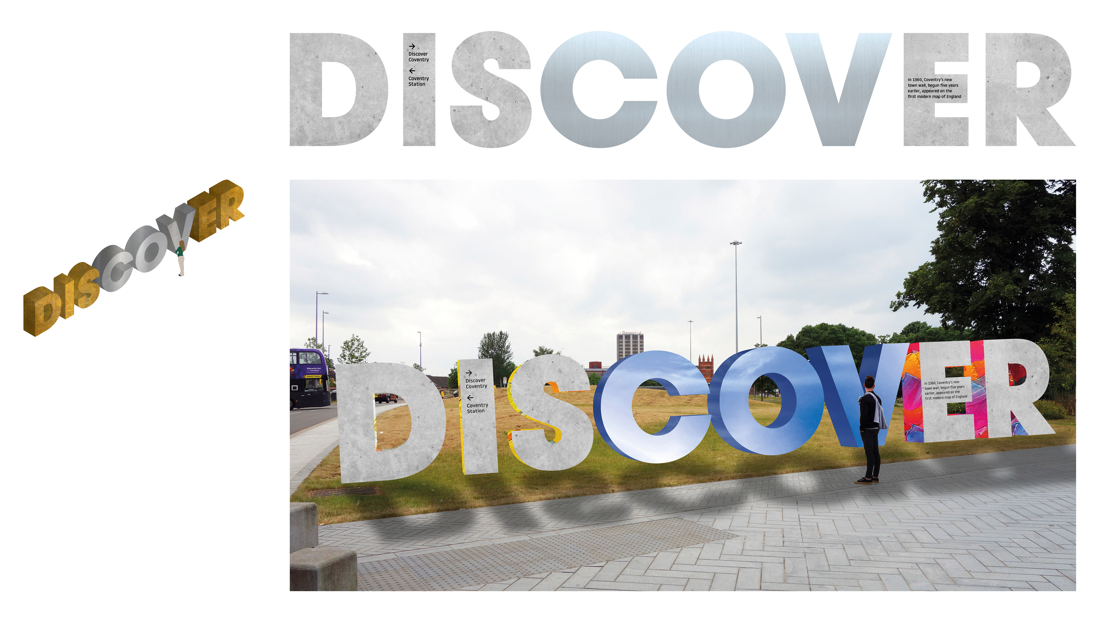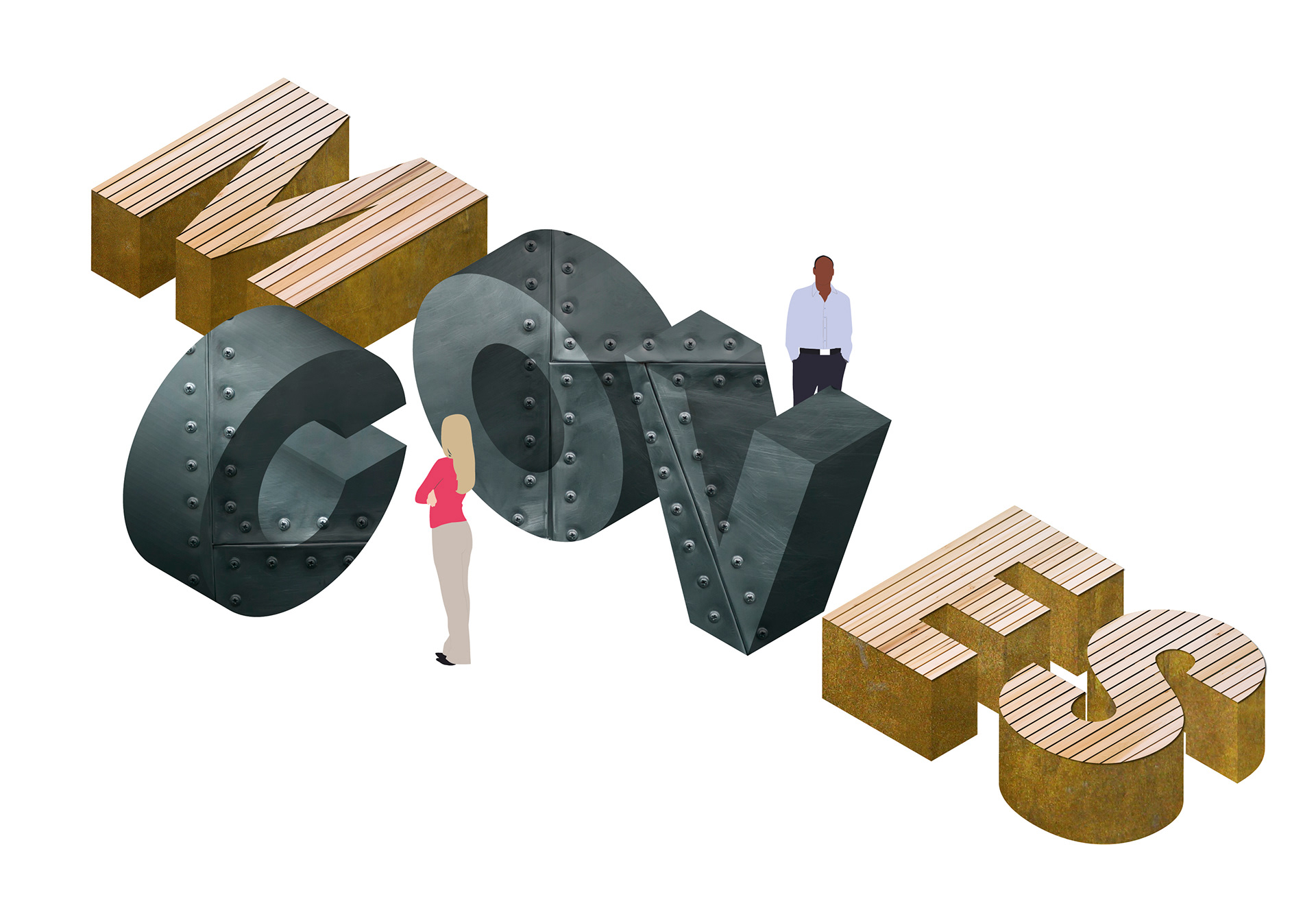 Making bold large sculptural supergraphic letters spelling ‘COV’ along with an invitation/vision word that includes the letters ‘C-O-V’. These are two-word poems, known as kennings, would be part sculpture, part seating and part narrative with the monolithic giant letters decorated with artworks, historical and community narratives. Visuals are designed to express the idea and intention and for the purposes of visualisation include library art and precedent images to give a sense of direction.