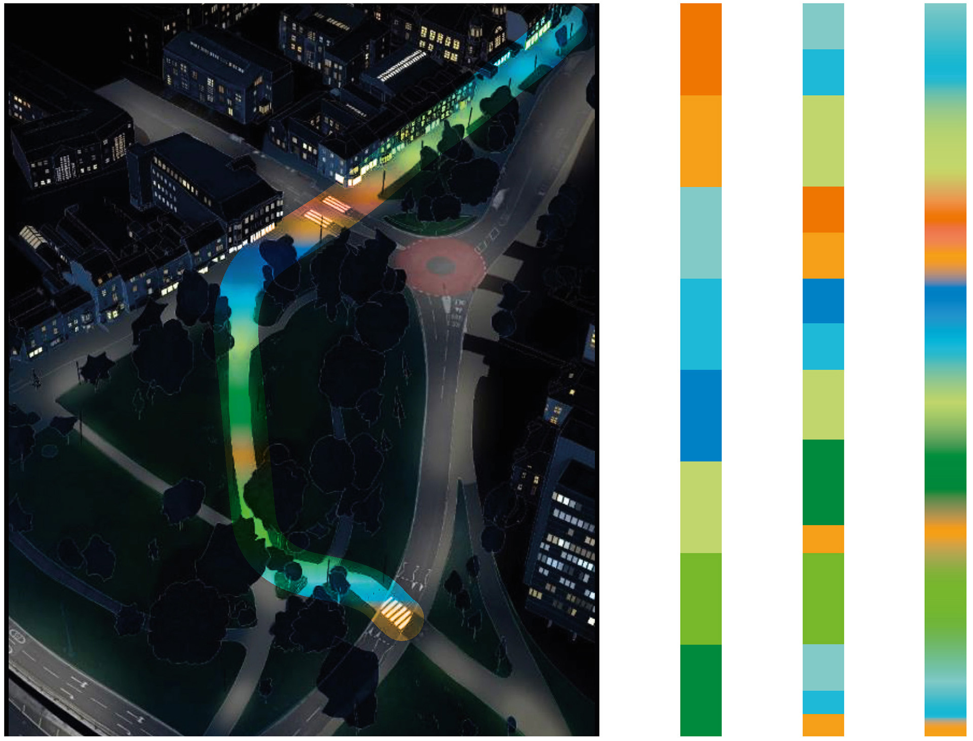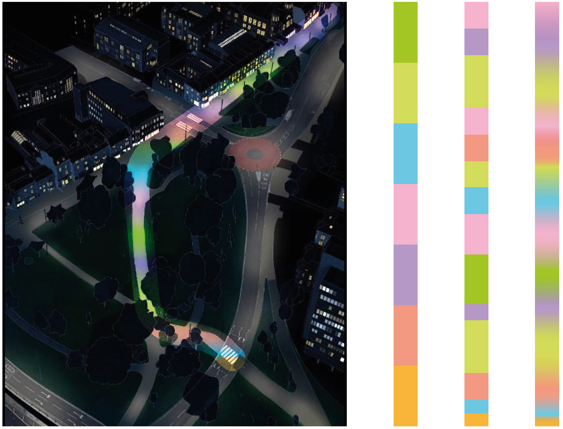 A lighting strategy was developed for the route from Greyfriars Green – Warwick Road end – through the park and along Warwick Row to Bull Yard. Asked to review the scheme and develop colour lighting palettes I proposed options that ranged from a single year-round colour palette, to an option that allowed for colour changes and is more flexible. Rather than a linear vignette of single colour to single colour, the proposal that the colours could be more ‘random’ so that colours have a flowing relationship. The scheme in which lighting could be changed in the more 'random' format was adopted.