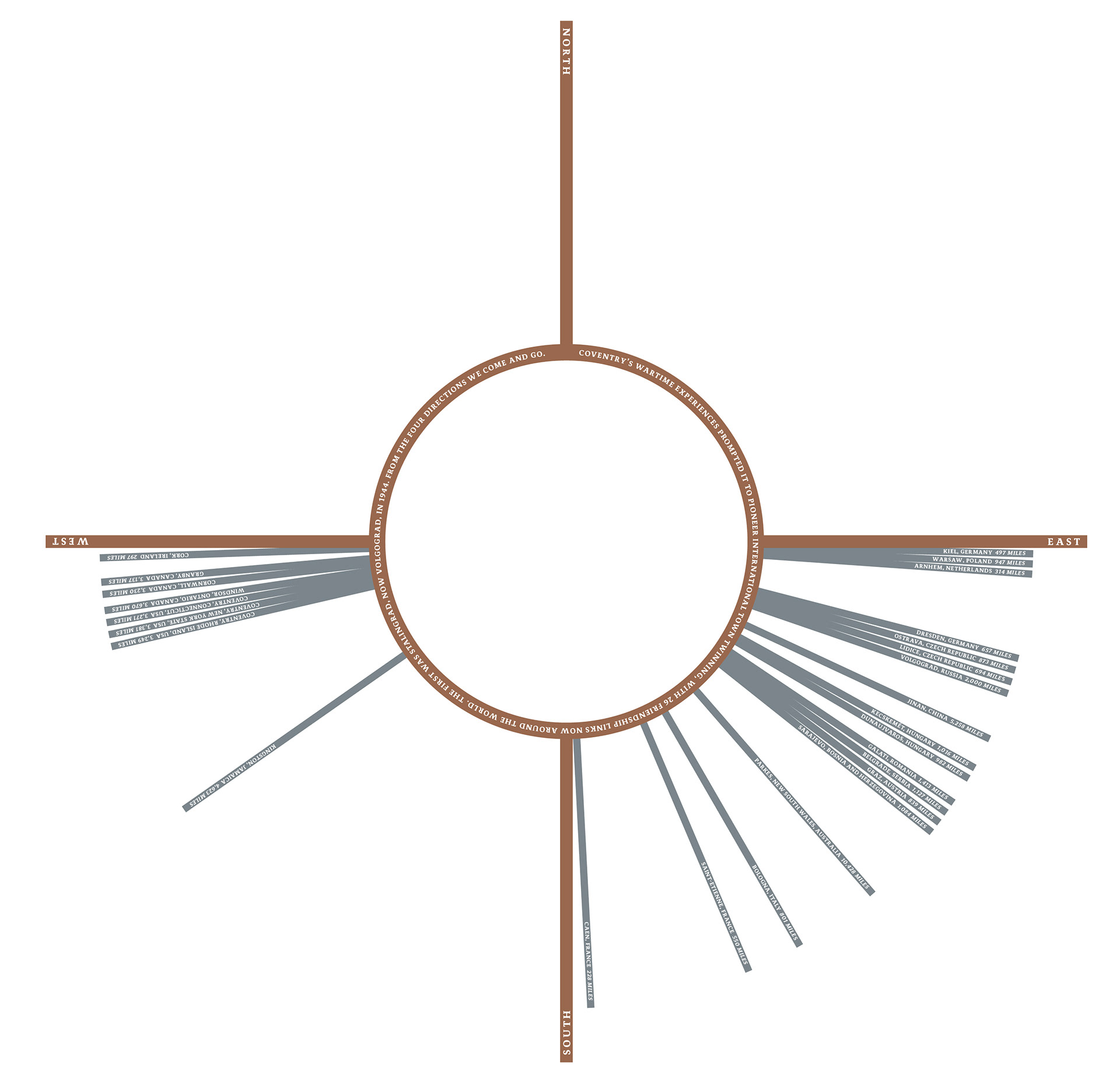 the UK. Each twinned place is also shown by indicating the global direction and distance. Coventry Cross throughout its history was the place in which people came to meet, for market and also as an attraction. People came from all over (from the four directions) and this contemporary design suggests how much farther we can make connections with people and places from around the world –