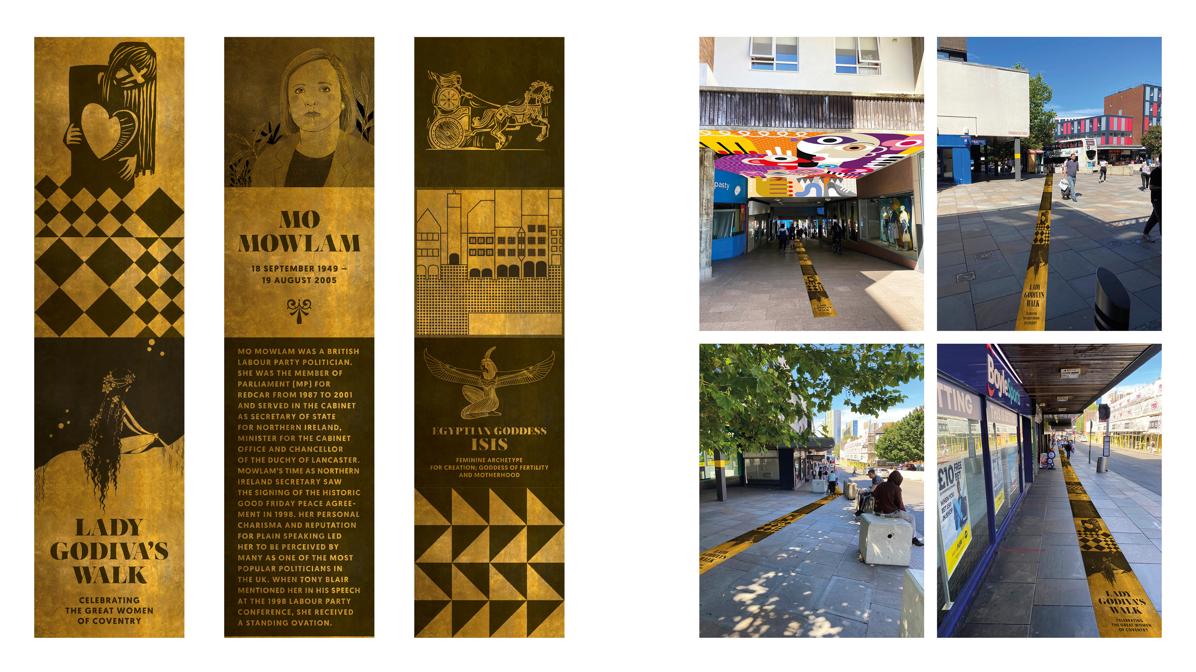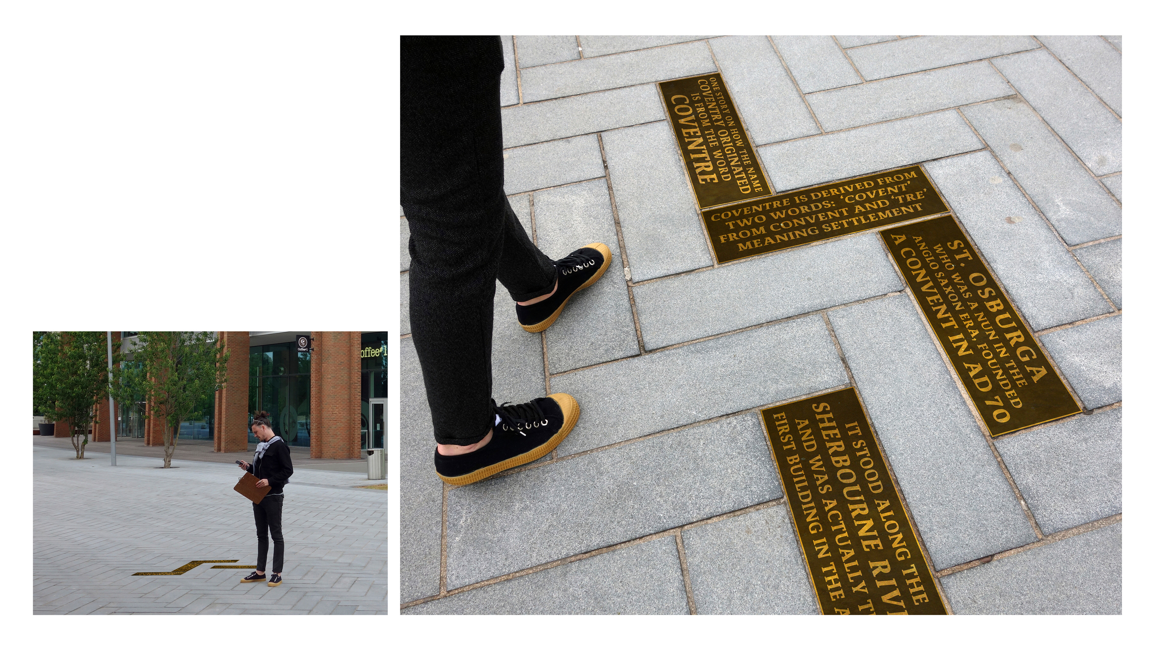'Lady Godiva's Walk': according to a local Coventry historian the line between Broadgate and along The Burges and back was the route that Lady Godiva took. This installation proposed the idea to celebrate the strong women of Coventry incl. Mo Mowlam, Pru Poretta, Pearl Hyde, Alice Arnold, St. Osburg, Alice Ellen Terry, Lady Herbert and others. A single embedded intervention line that runs the length of the route with information, illustrations, and moments of community contributions would celebrate the women