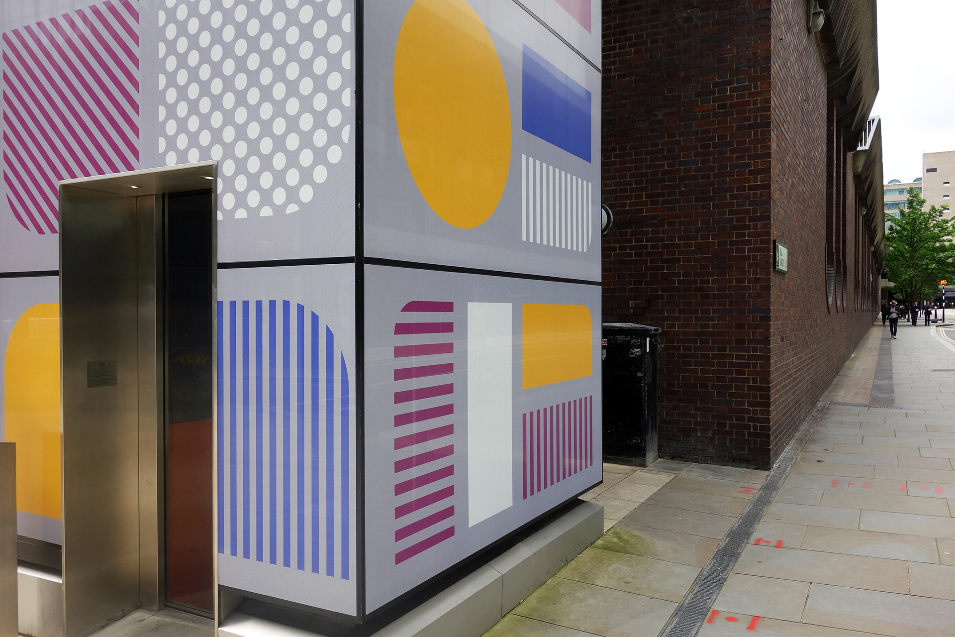 Located on the corner of Moor Lane and Silk Street by The Barbican the glass lift has been wrapped in designs to create a totemic landmark. Fabrication and installation by Glyphics.