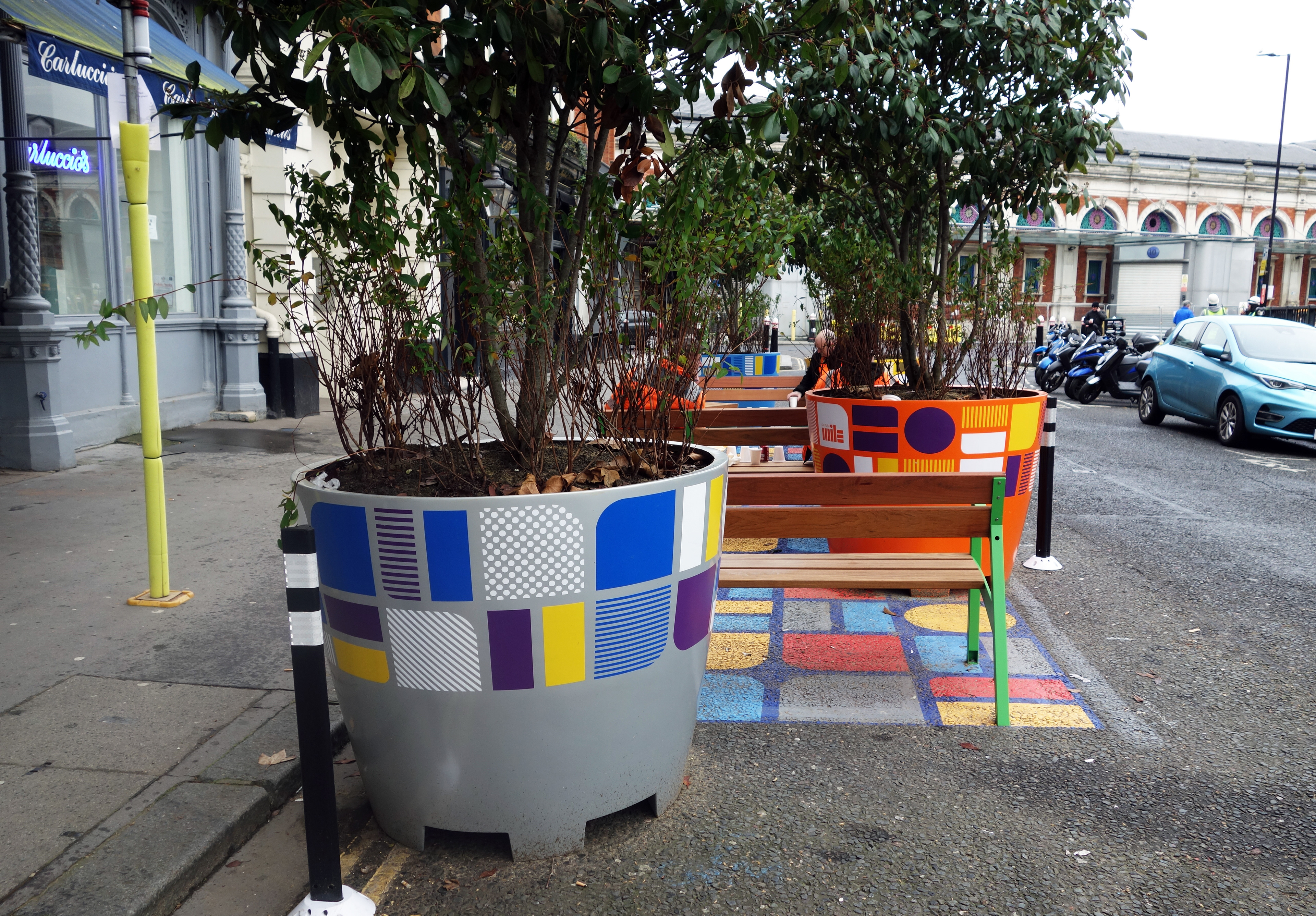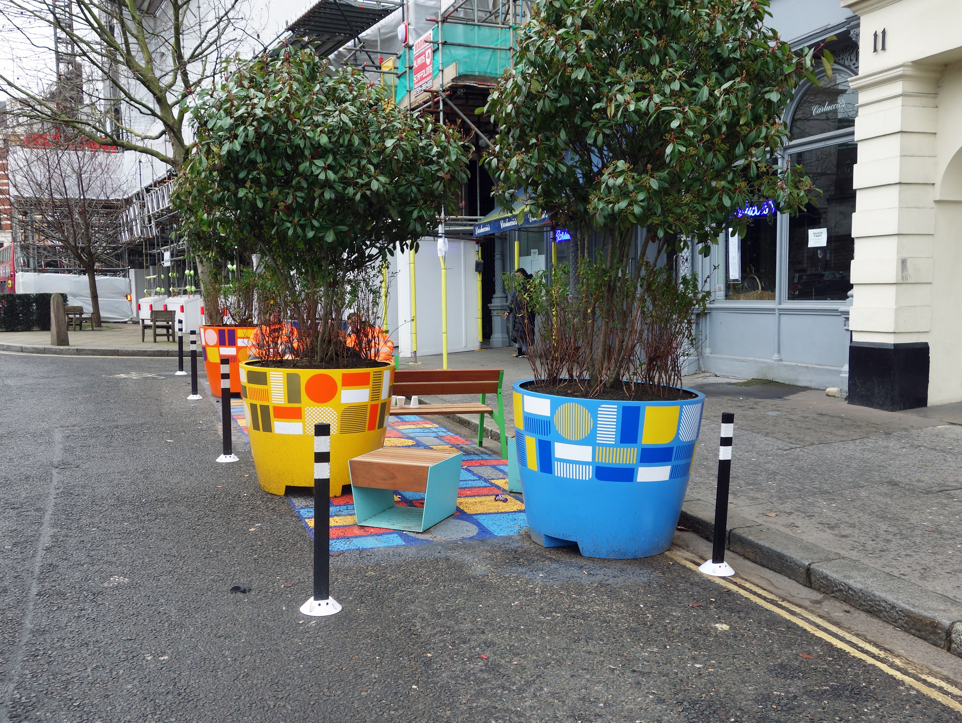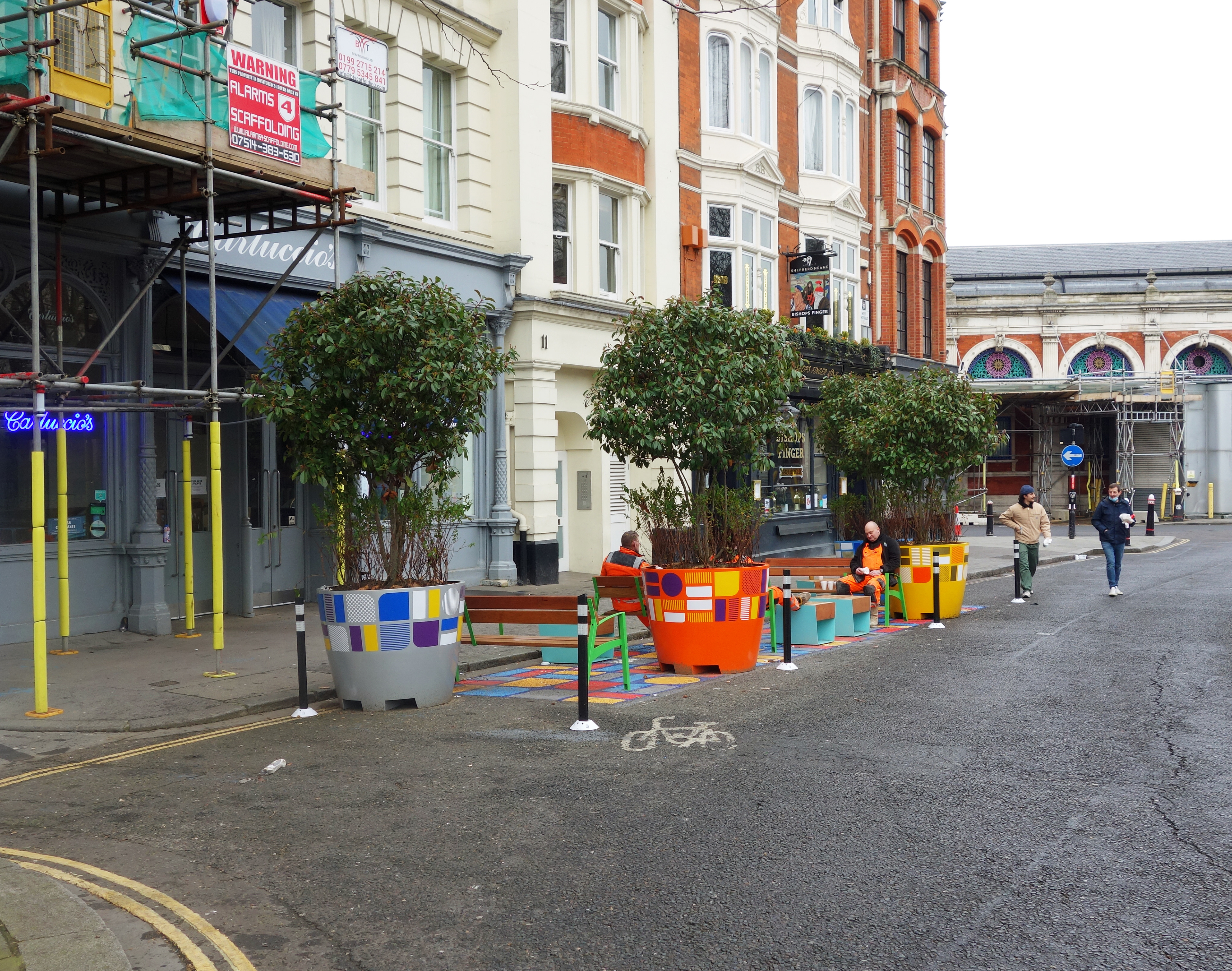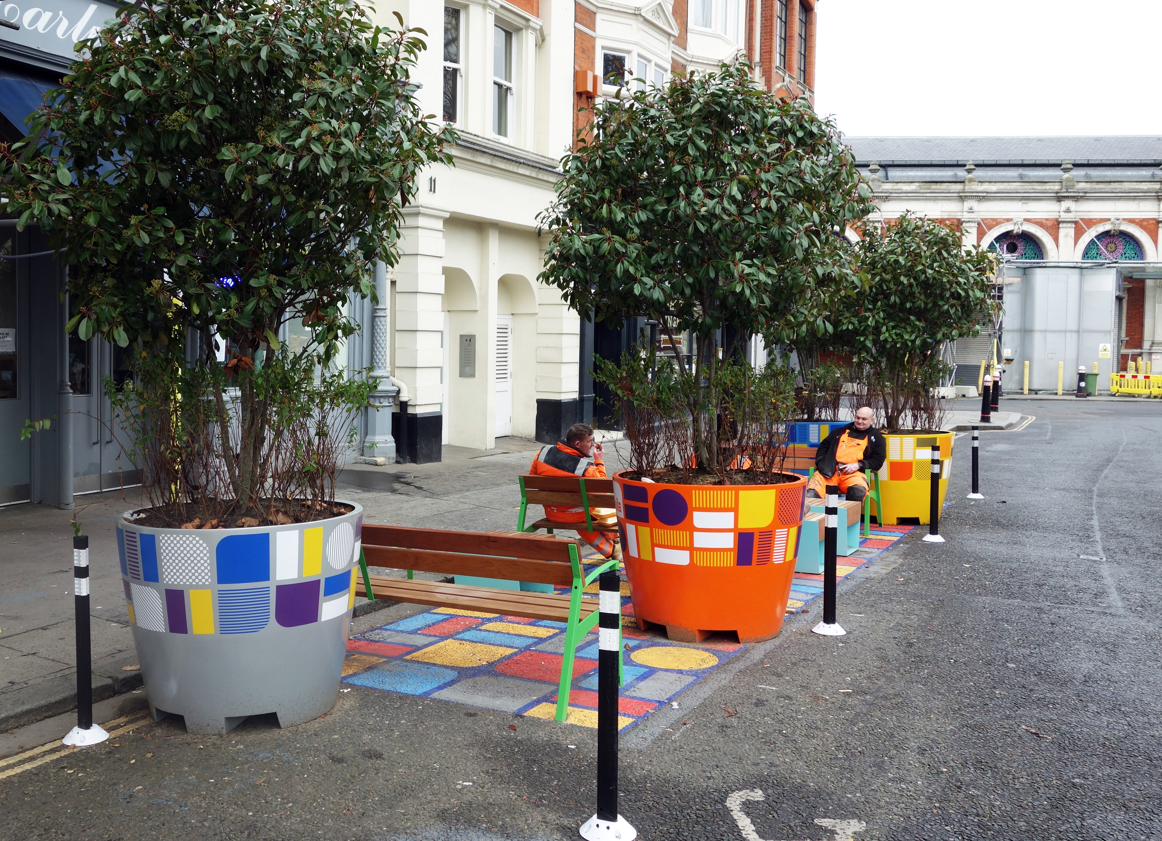 The West Smithfield intervention replaces the previous cablet space outside of Carluccio’s around the Smithfield Rotunda. A ground area of approximately 10m x 2m the temporary parklet includes opportunities to sit and introduces the Culture Mile identity