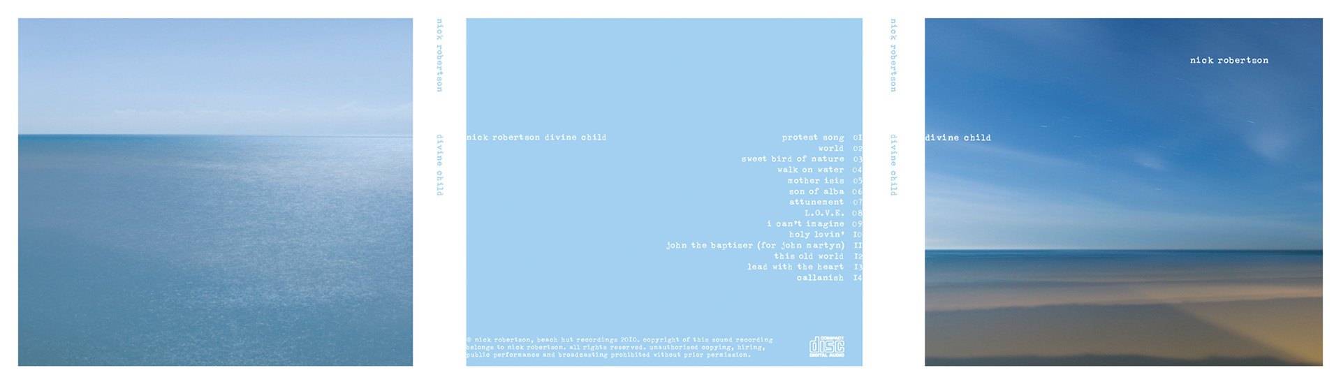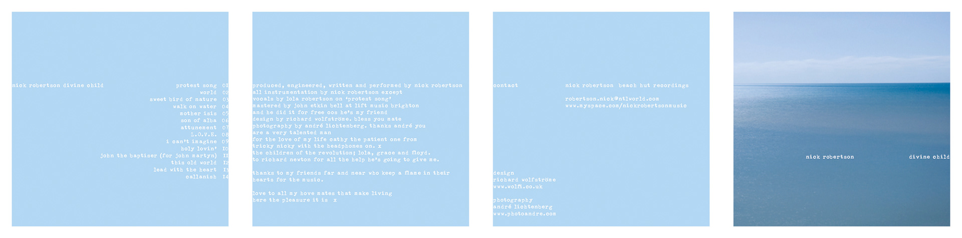 CD package for singer songwriter Nick Robertson. A six page digipac holds CD and eight page booklet for information and lyrics. Using stunning photography by André Lichtenberg (www.photoandre.com), the design and typography reflects the beauty and sensitivity of the music. Hear Nick’s music at www.myspace.com/nickrobertsonmusic.