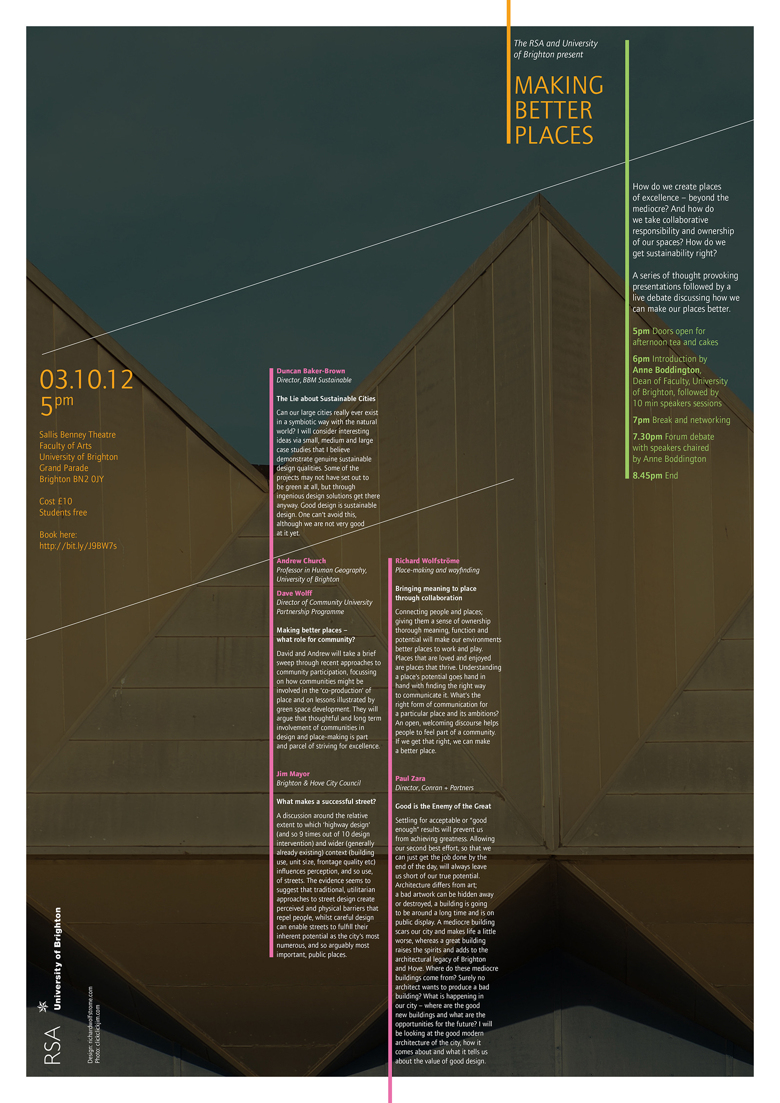 Poster for RSA and University of Brighton symposium Making better places. How do we create places of excellence – beyond the mediocre? And how do we take collaborative responsibility and ownership of our spaces? How do we get sustainability right? A series of thought provoking presentations followed by a live debate discussing how we can make our places better.