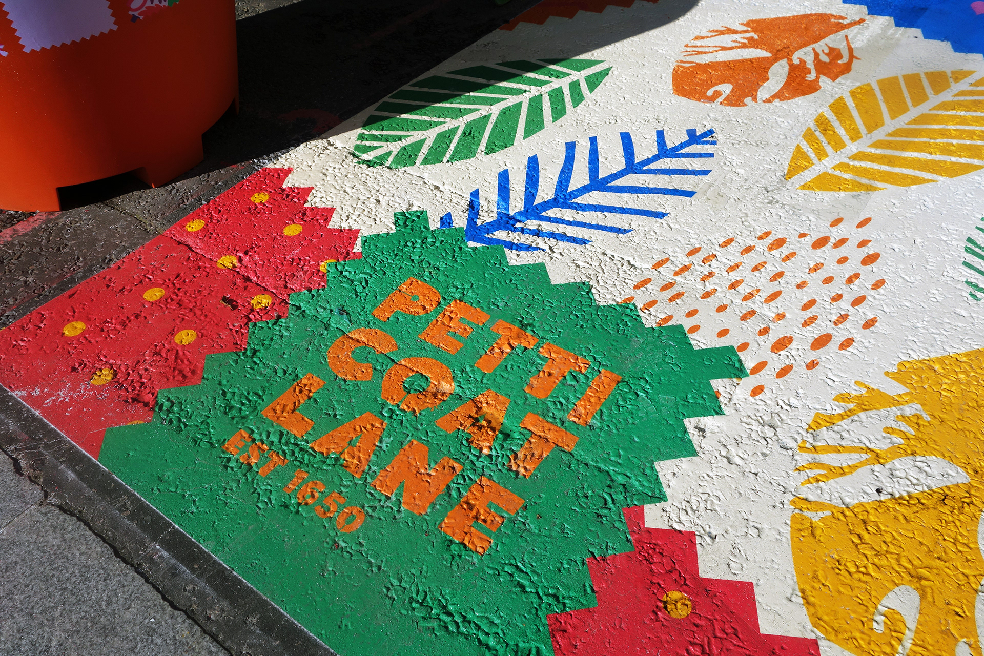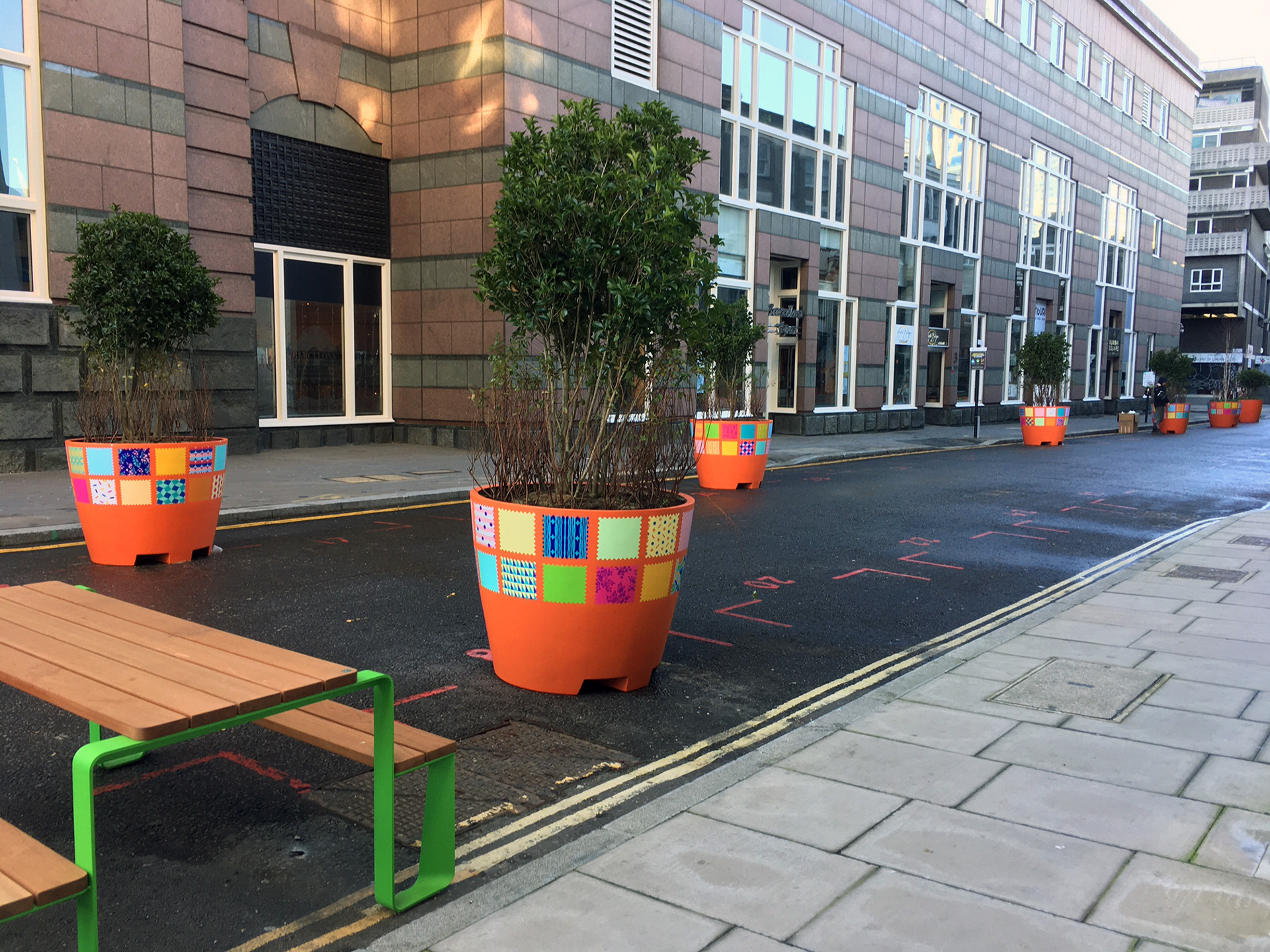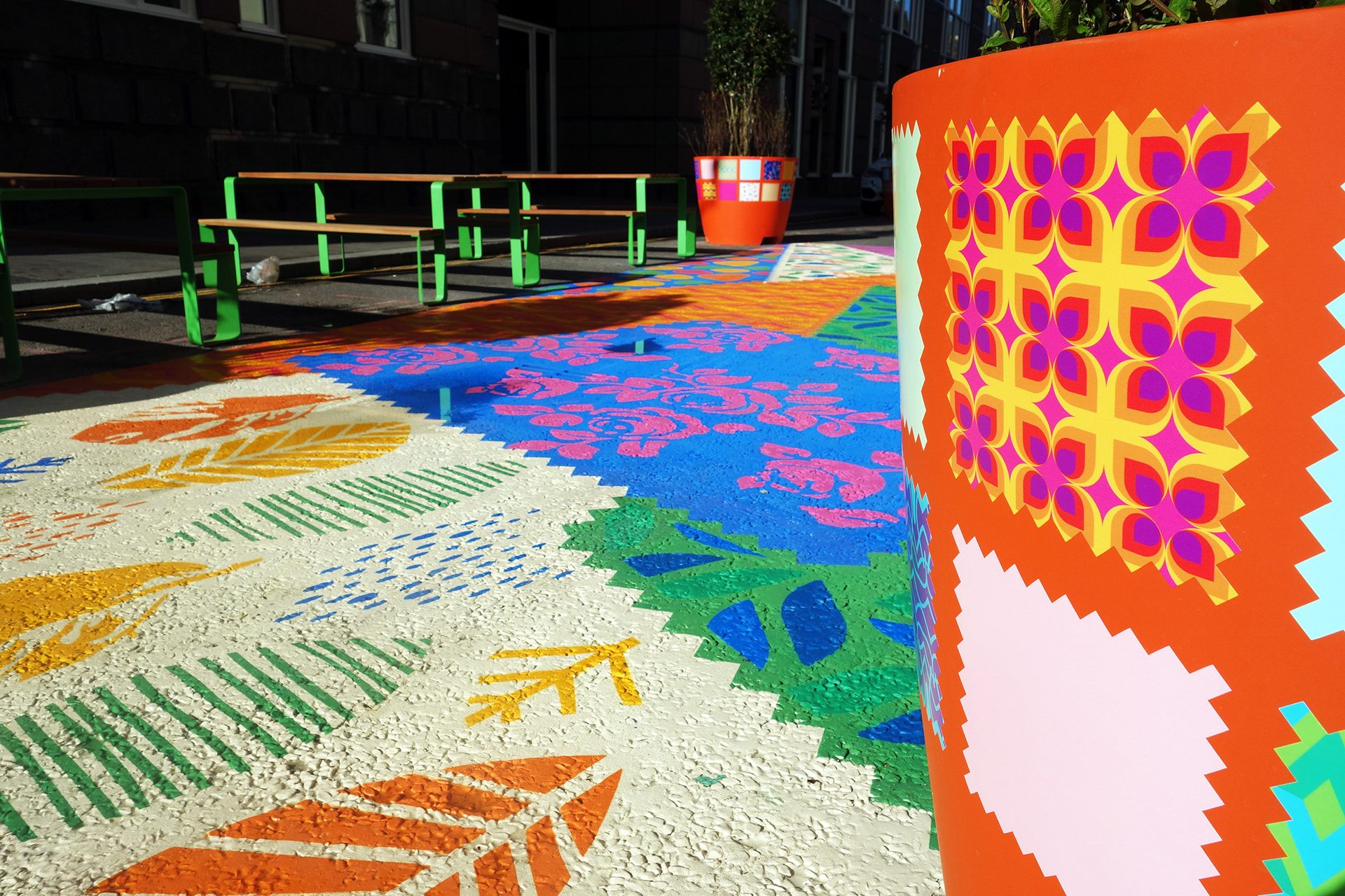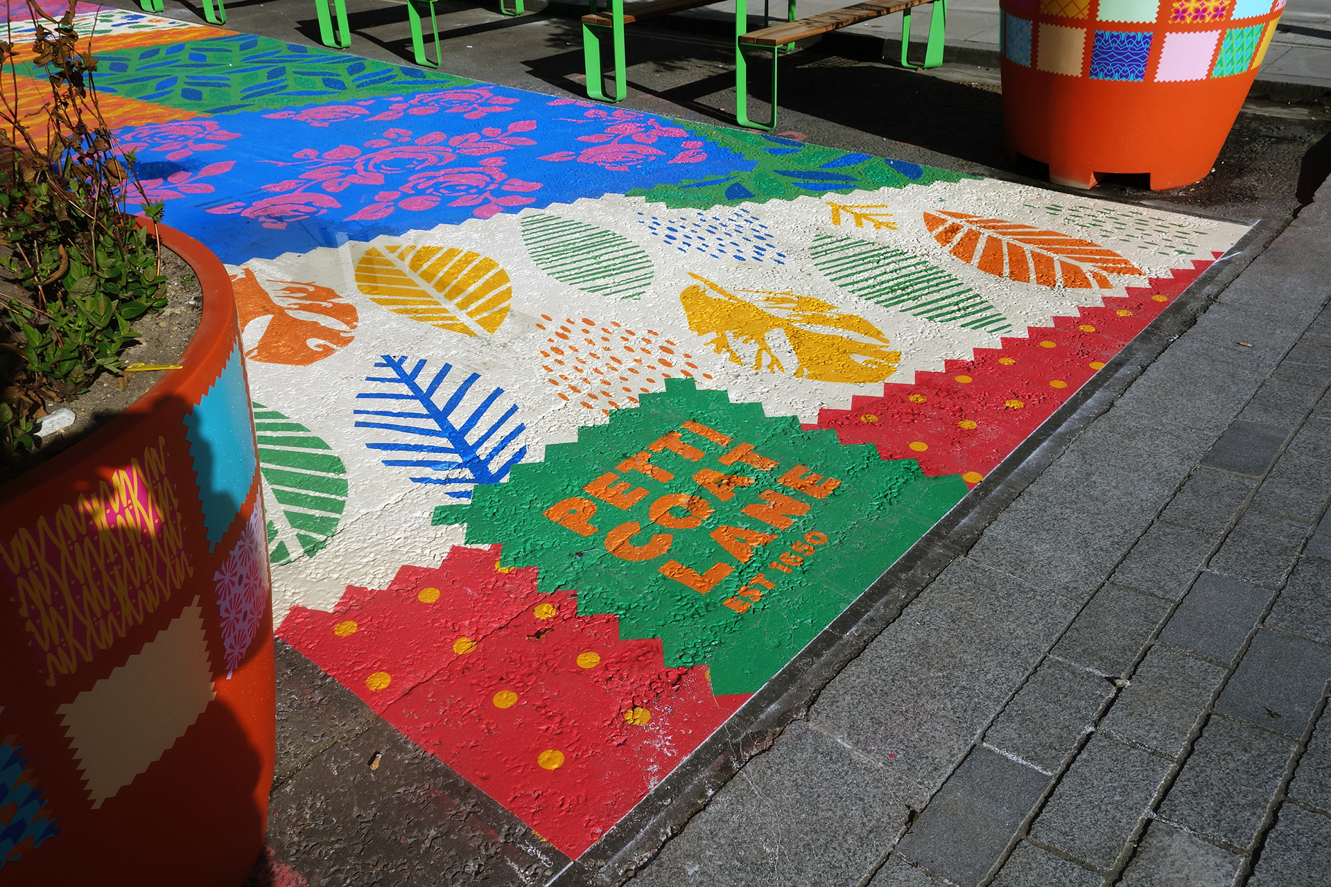 Located on Middlesex Street the installation celebrates the rich fashion and textile industry heritage of this famous London landmark with its vibrant market and diverse local community, and reflects the colourful styles and history that has been woven over the past hundreds of years. A painted groundwork piece measuring 12m x 4m is complemented by textile swatch designs installed onto nine planters. Fabrication and installation by Standard 8.