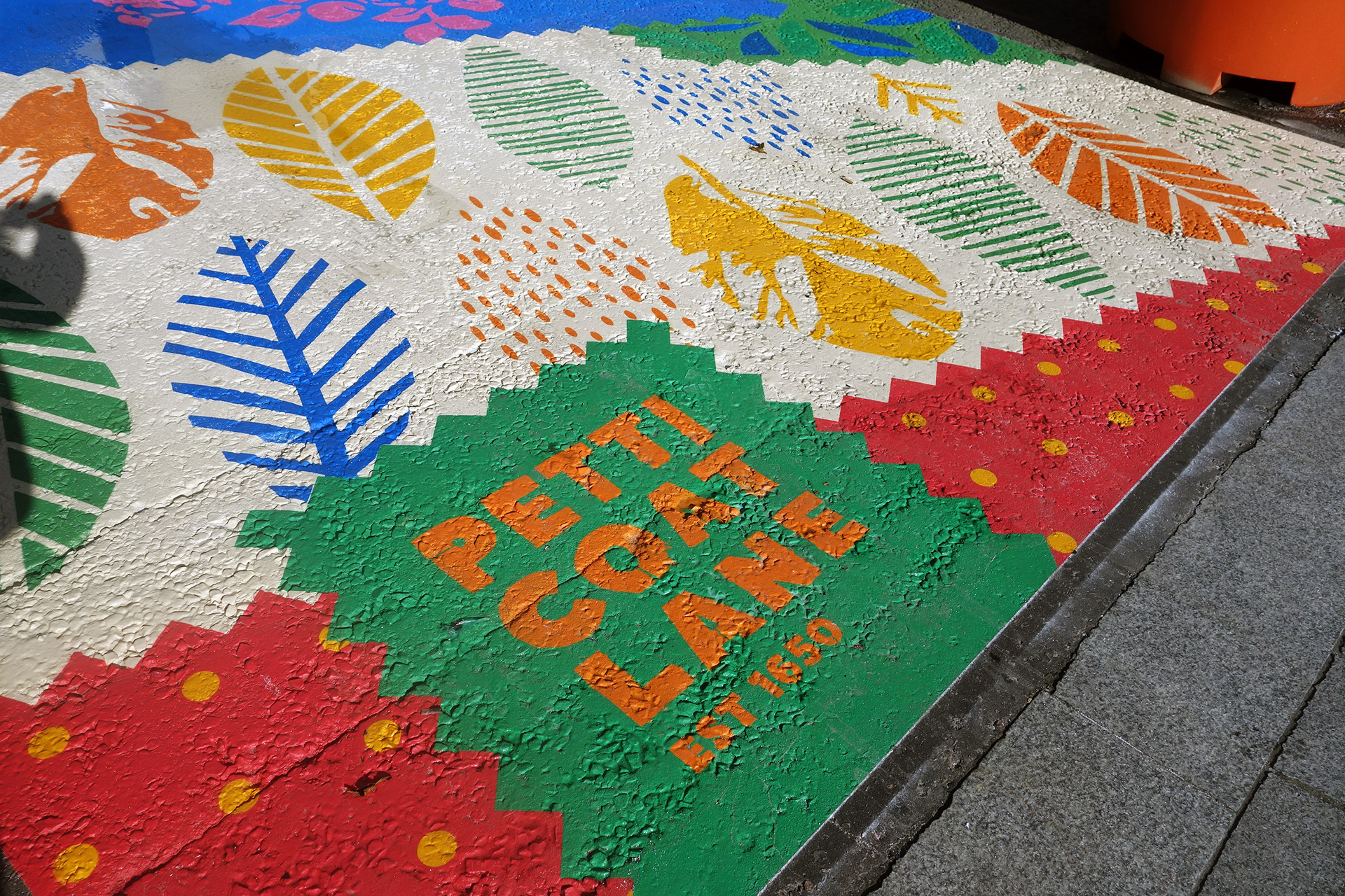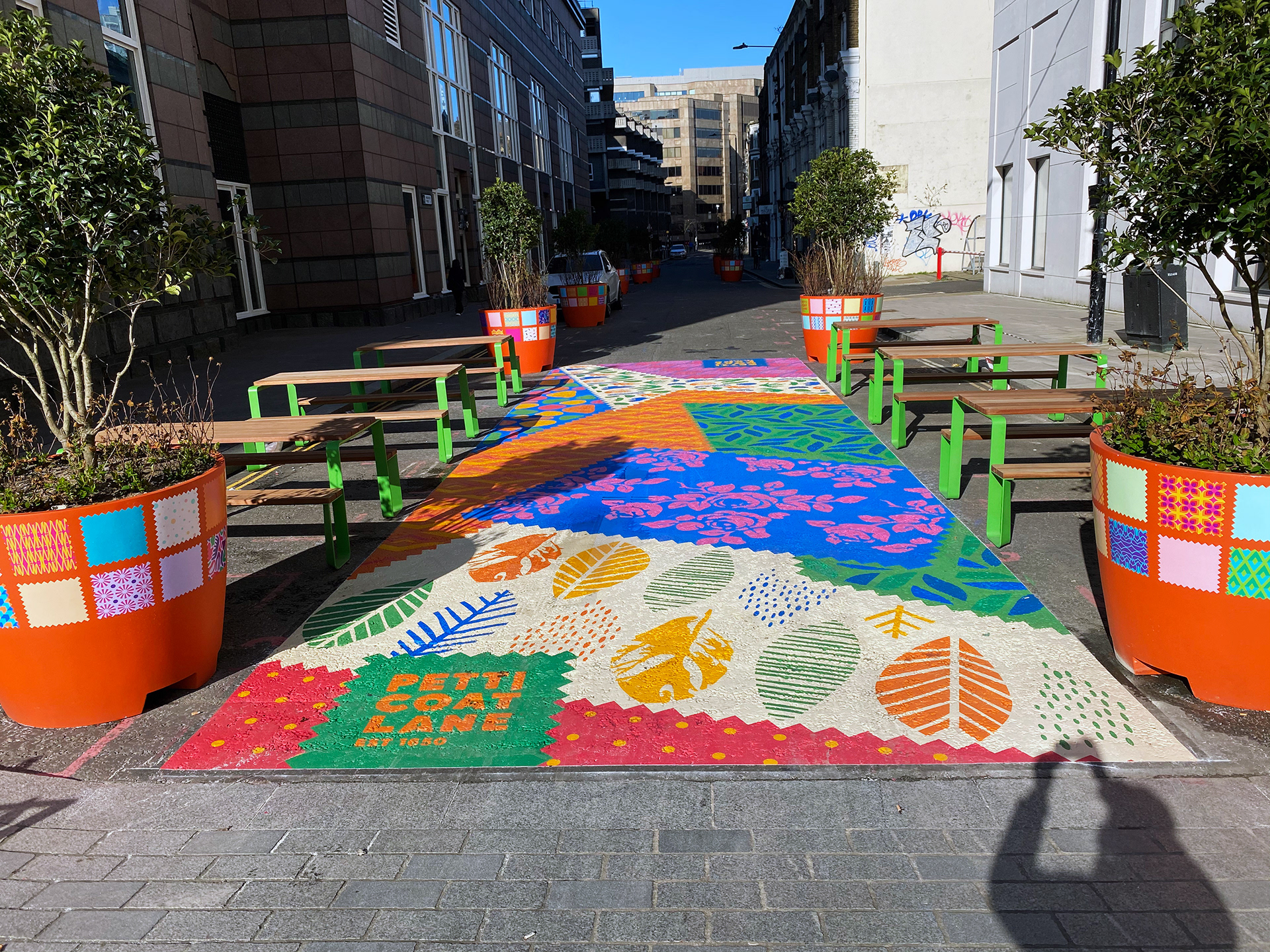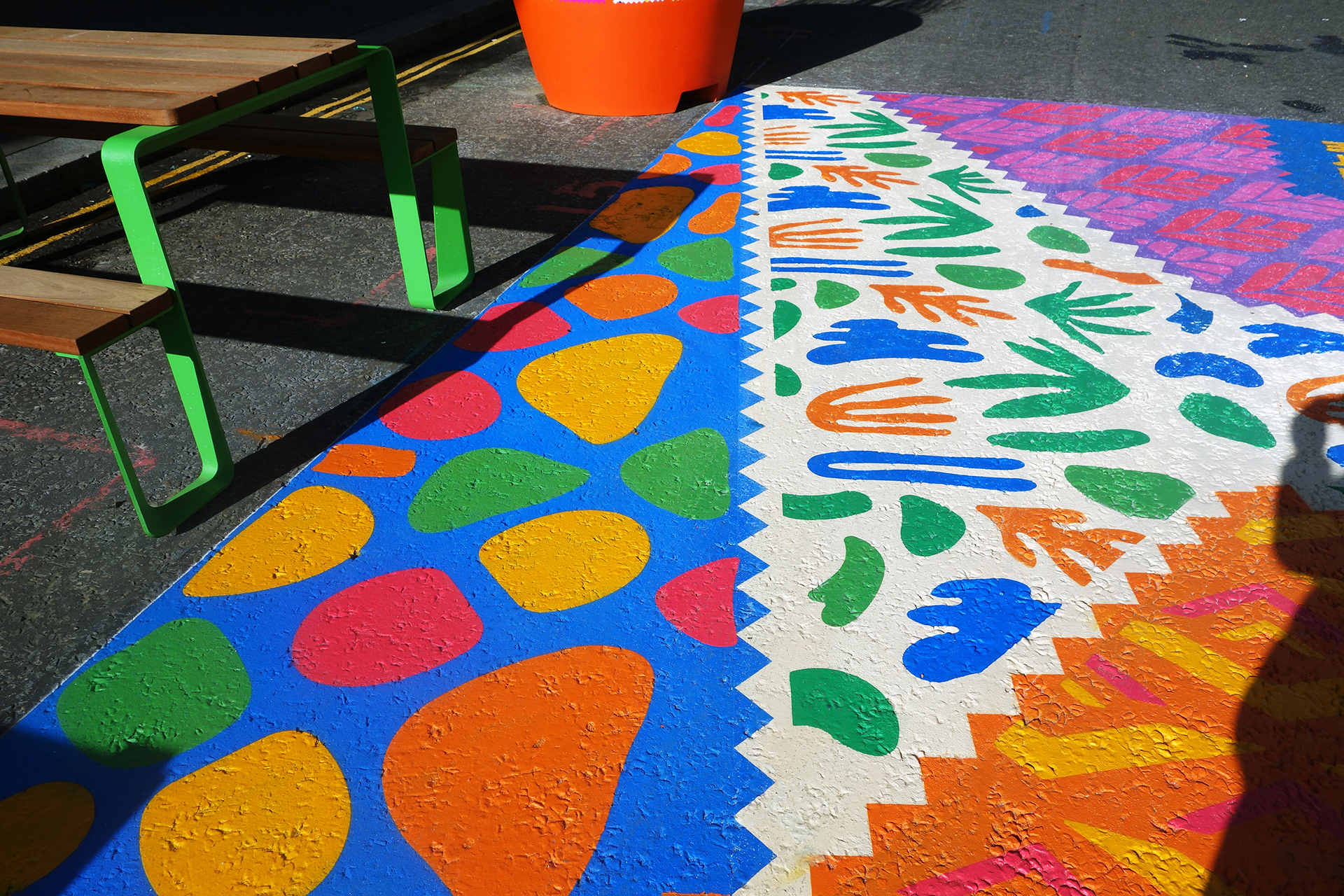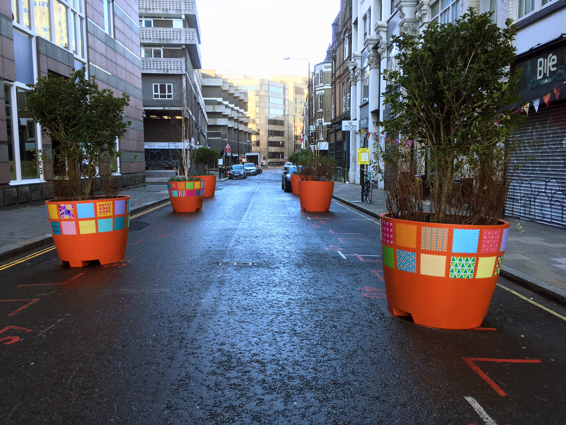 Located on Middlesex Street the installation celebrates the rich fashion and textile industry heritage of this famous London landmark with its vibrant market and diverse local community, and reflects the colourful styles and history that has been woven over the past hundreds of years. A painted groundwork piece measuring 12m x 4m is complemented by textile swatch designs installed onto nine planters. Fabrication and installation by Standard 8.