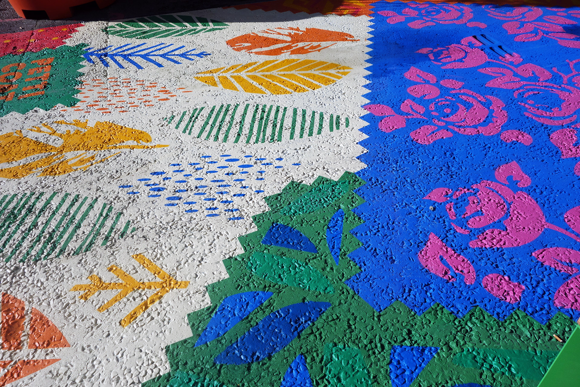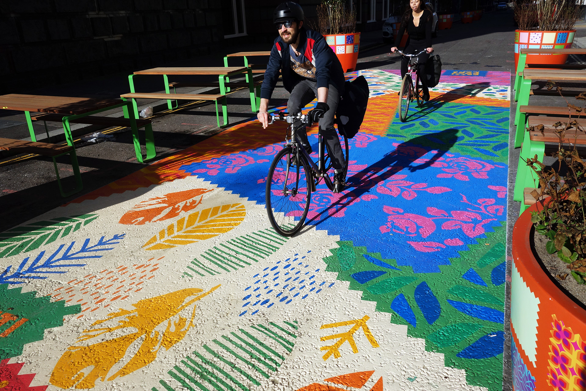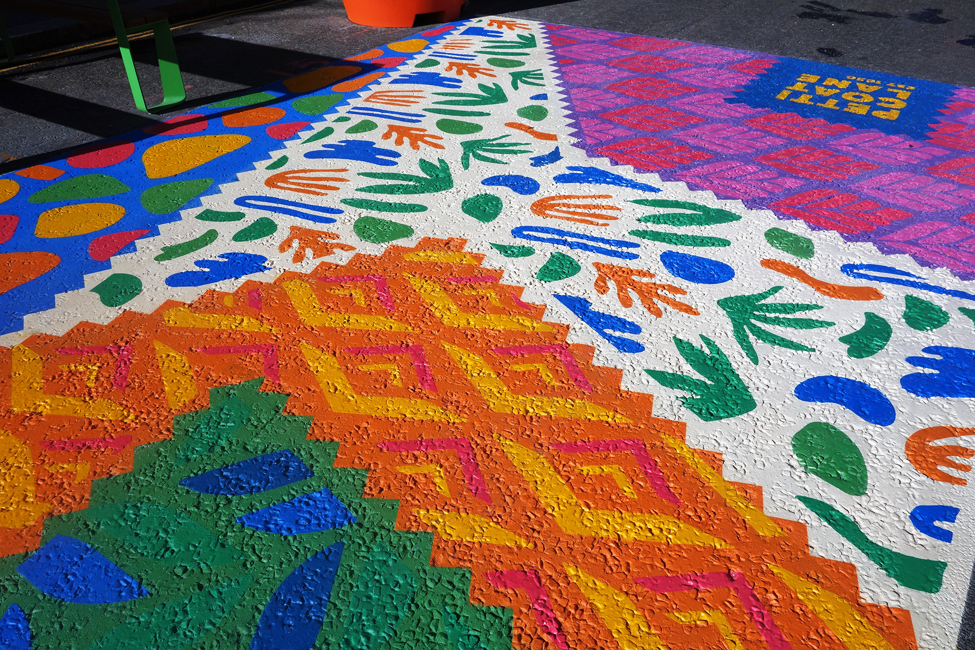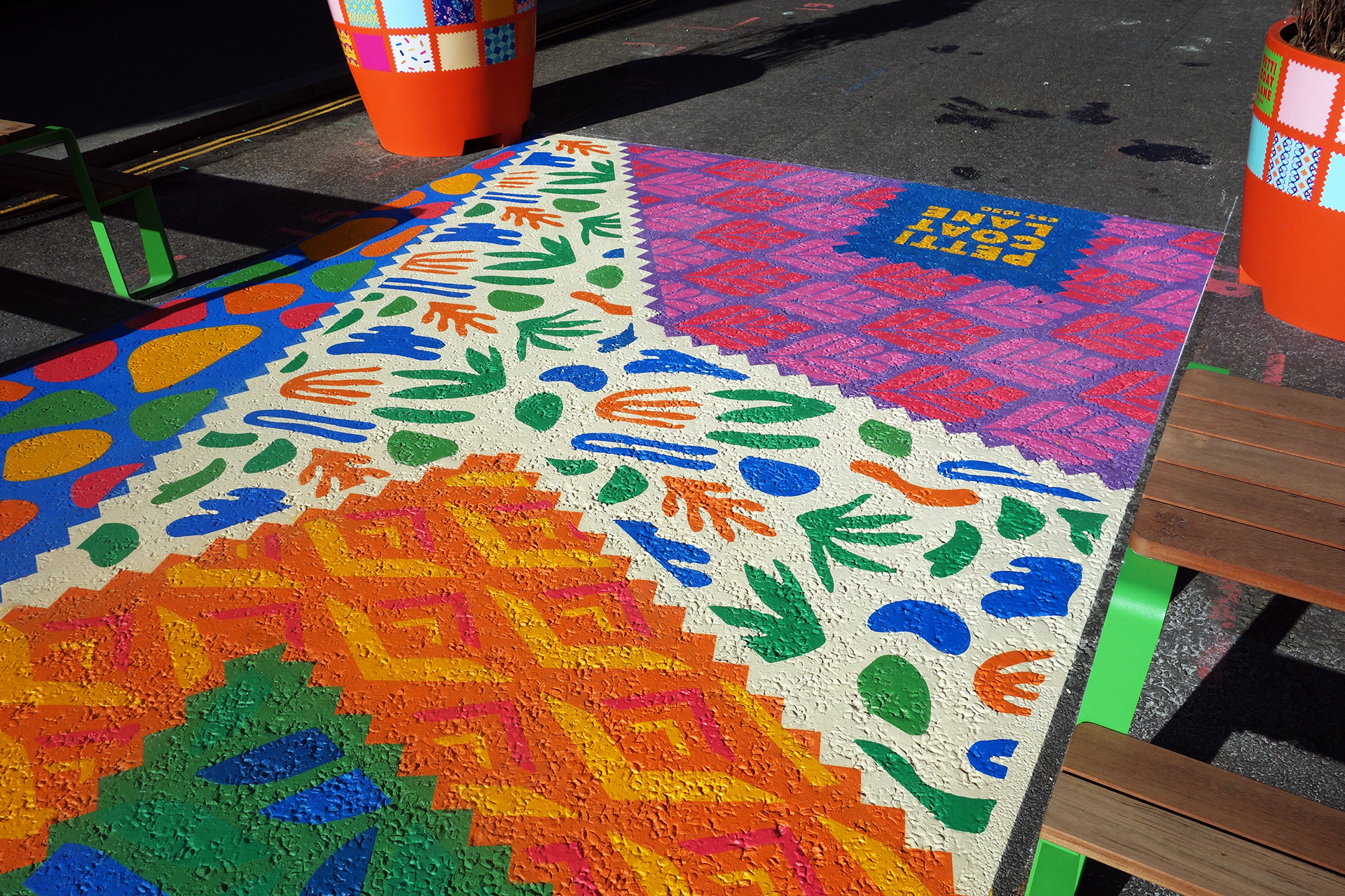 Located on Middlesex Street the installation celebrates the rich fashion and textile industry heritage of this famous London landmark with its vibrant market and diverse local community, and reflects the colourful styles and history that has been woven over the past hundreds of years. A painted groundwork piece measuring 12m x 4m is complemented by textile swatch designs installed onto nine planters. Fabrication and installation by Standard 8.