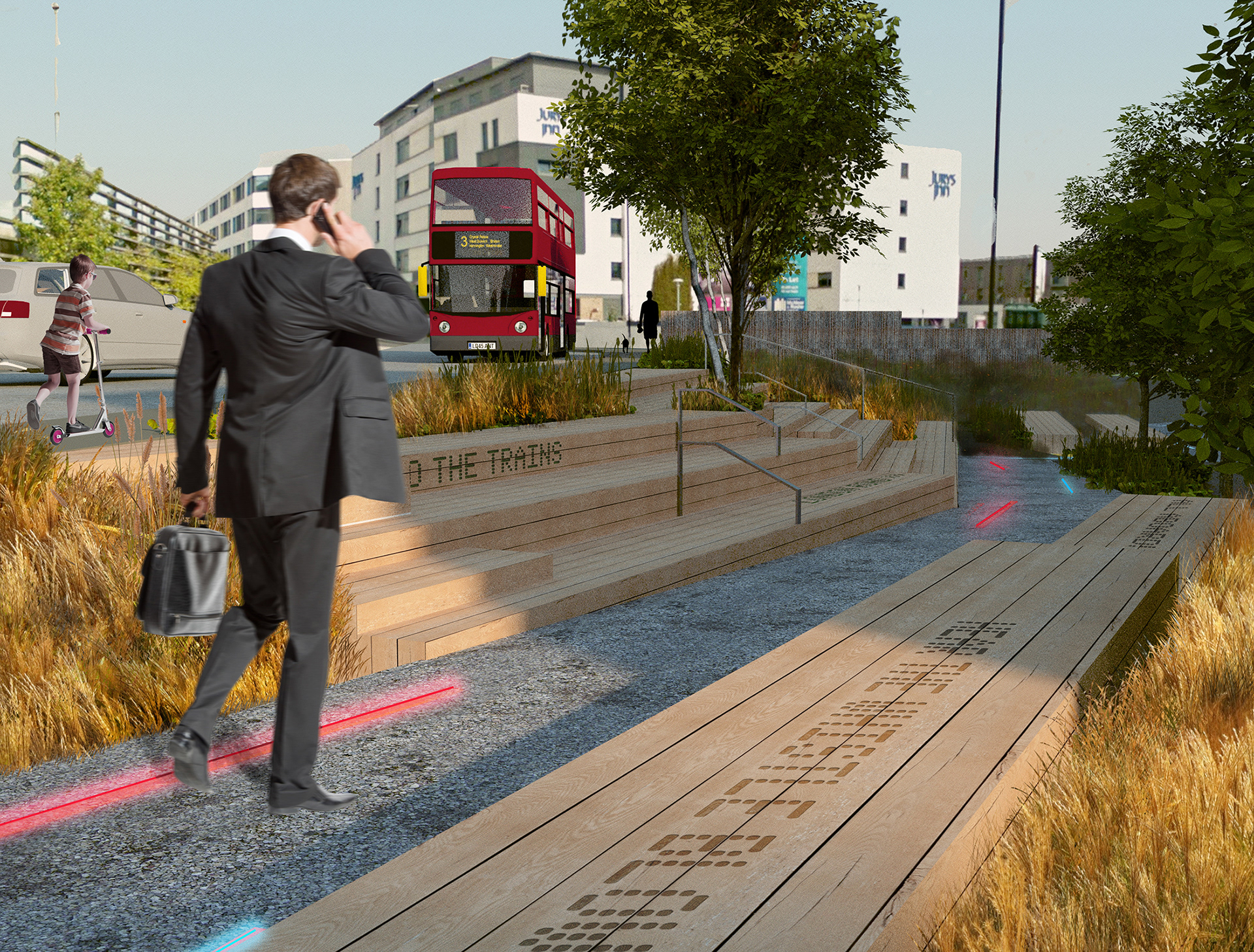 Phrases and texts would have been incorporated into the platform seating-steps that took their inspiration from the lexicon of rail travel. They would have been playful and evocative of the station, of rail travel and the railways and bring an additional textural layer to the creative placemaking design.