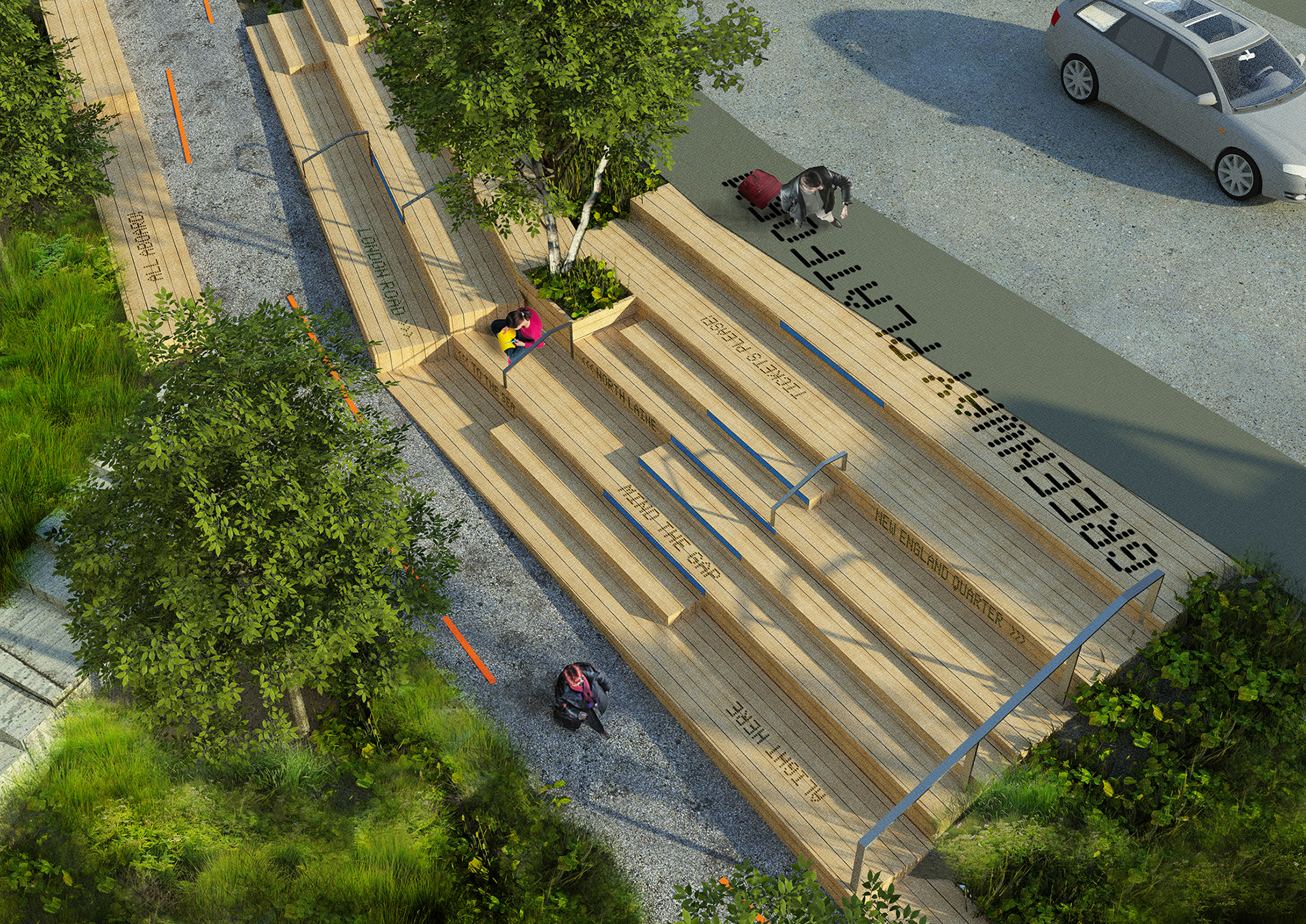 The two step-ways down from the road level into the site were placed to not only create a seating bank, but also anticipate the inevitable cut-through desire lines of place users entering and exiting the Greenway Platform to the car park area of the site.