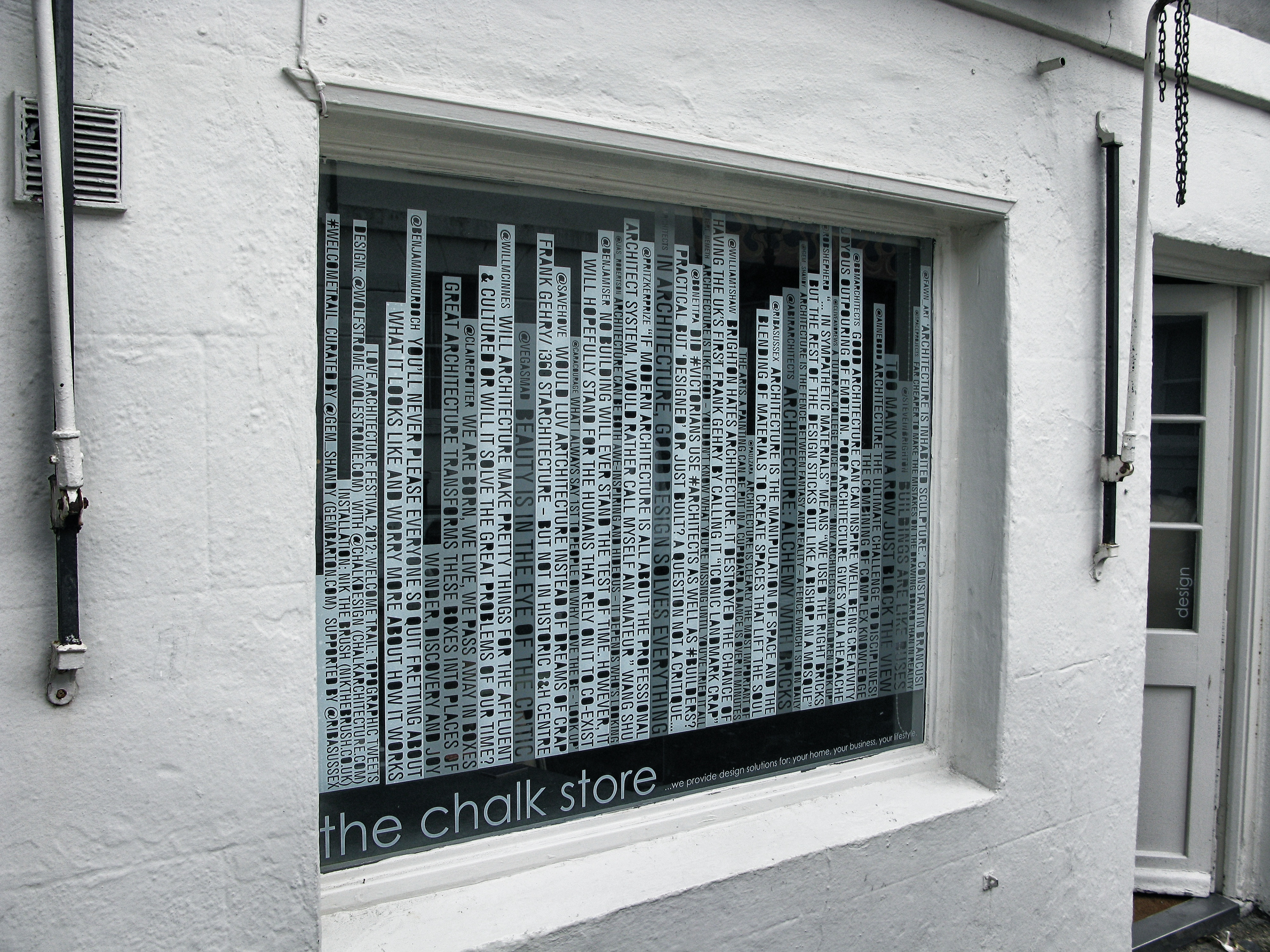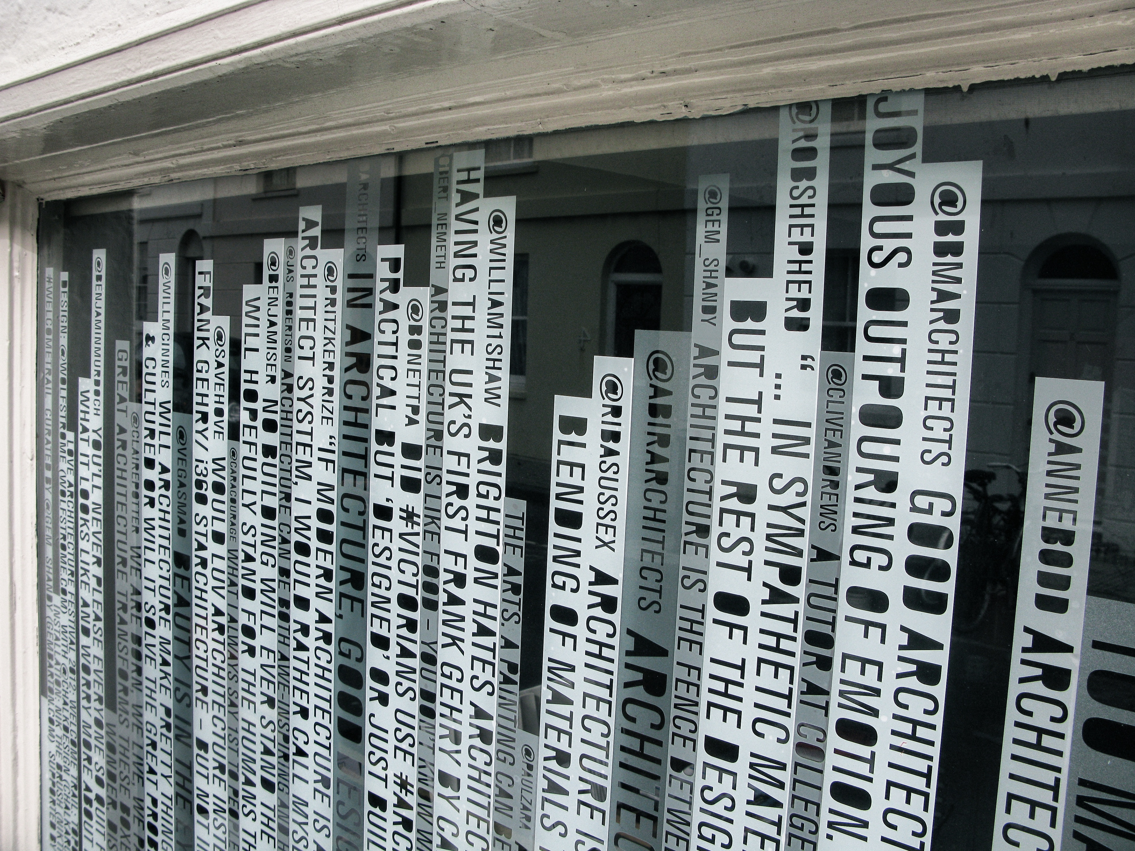 Topographic Tweets partnered Richard Wolfstrome with Chalk Architects to create an installation on the Chalk studio window for The Welcome Trail, curated by Gem Barton, as part of the Love Architecture Festival 2012 in Brighton, UK and Threshold. A ‘pop-up’ installation taking just ten days from idea to finished artwork, it engages and creates a community narrative with the face of architecture.
