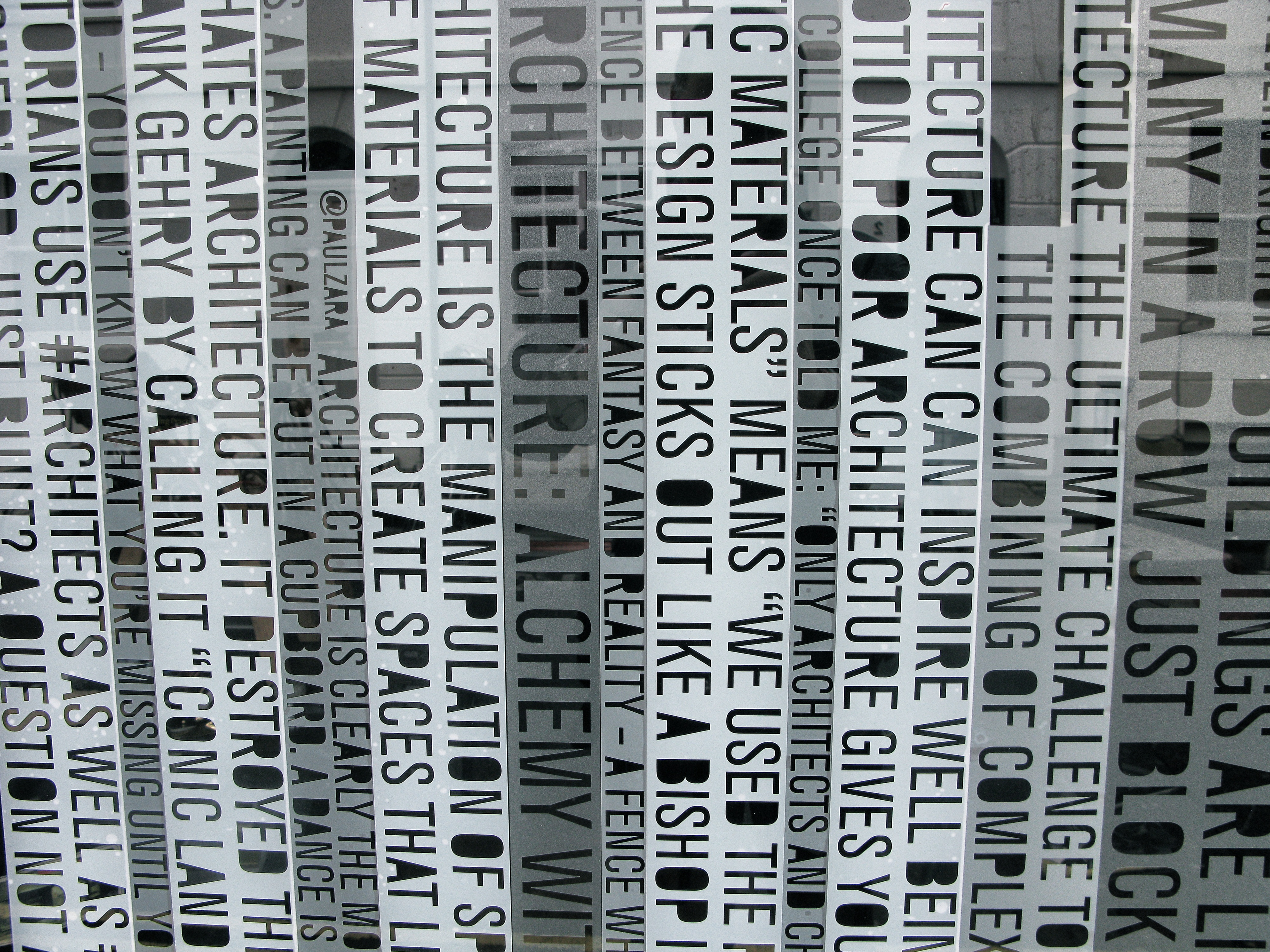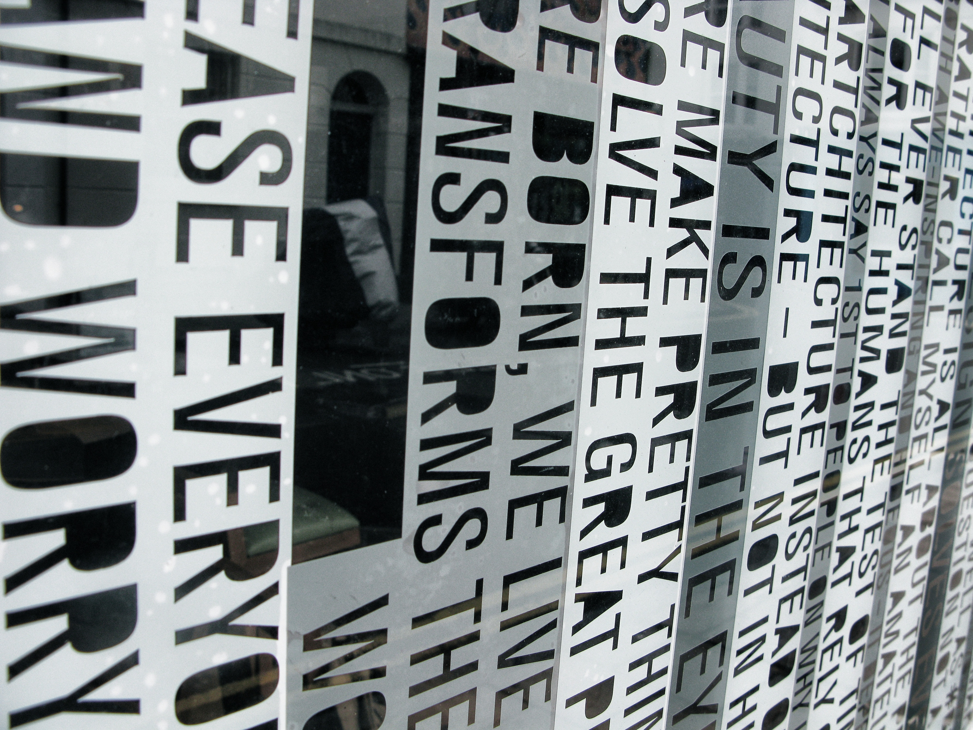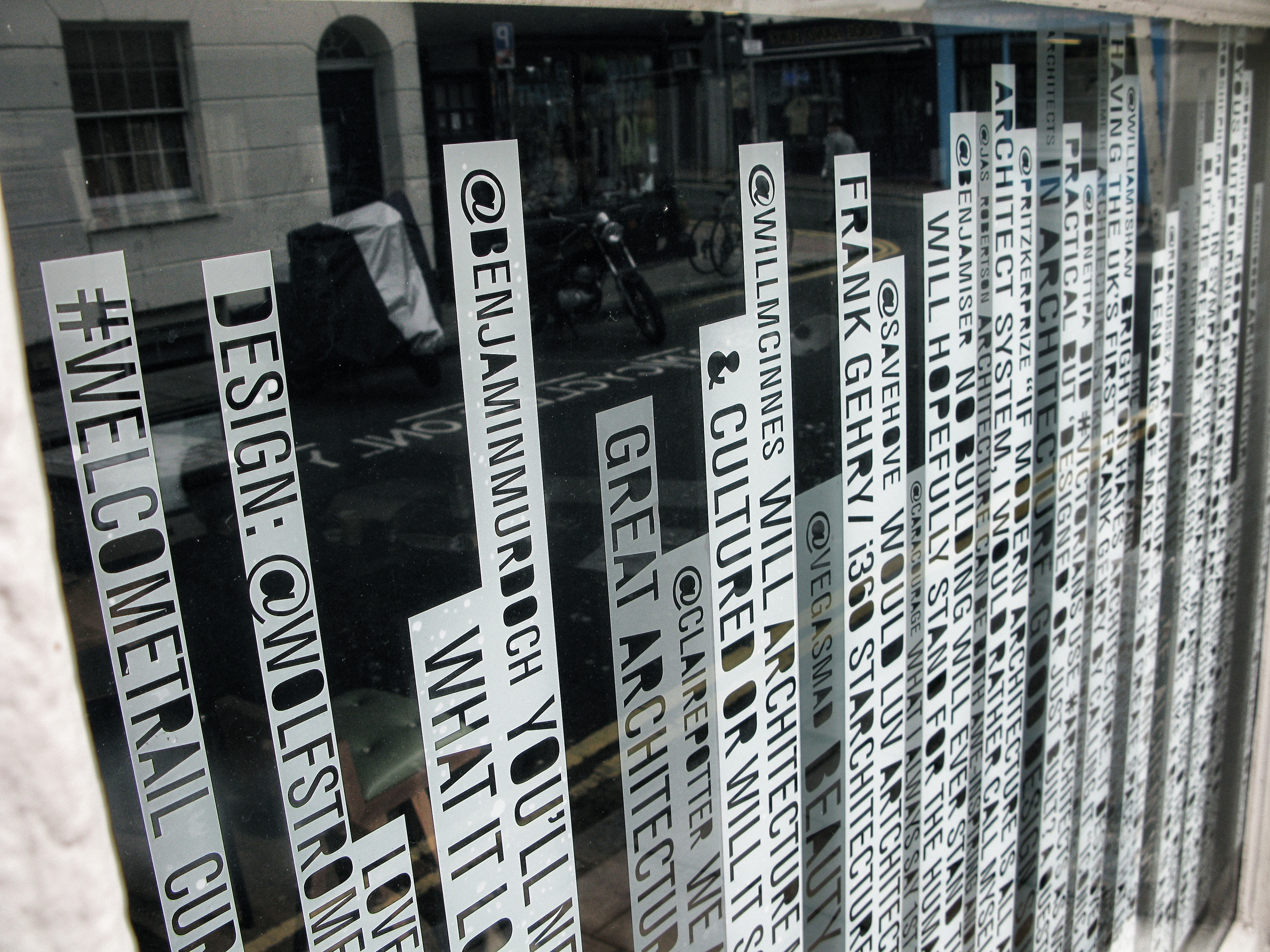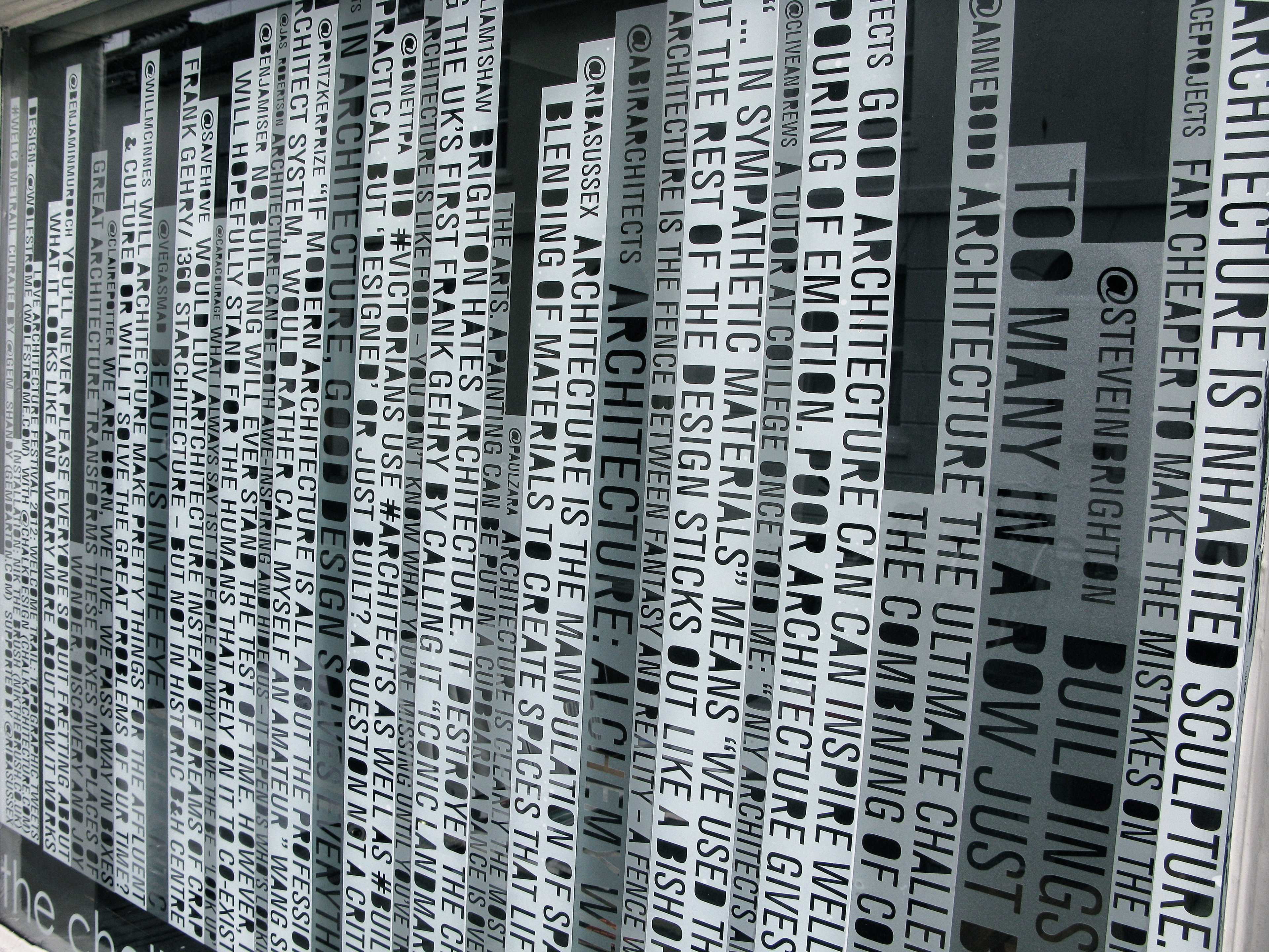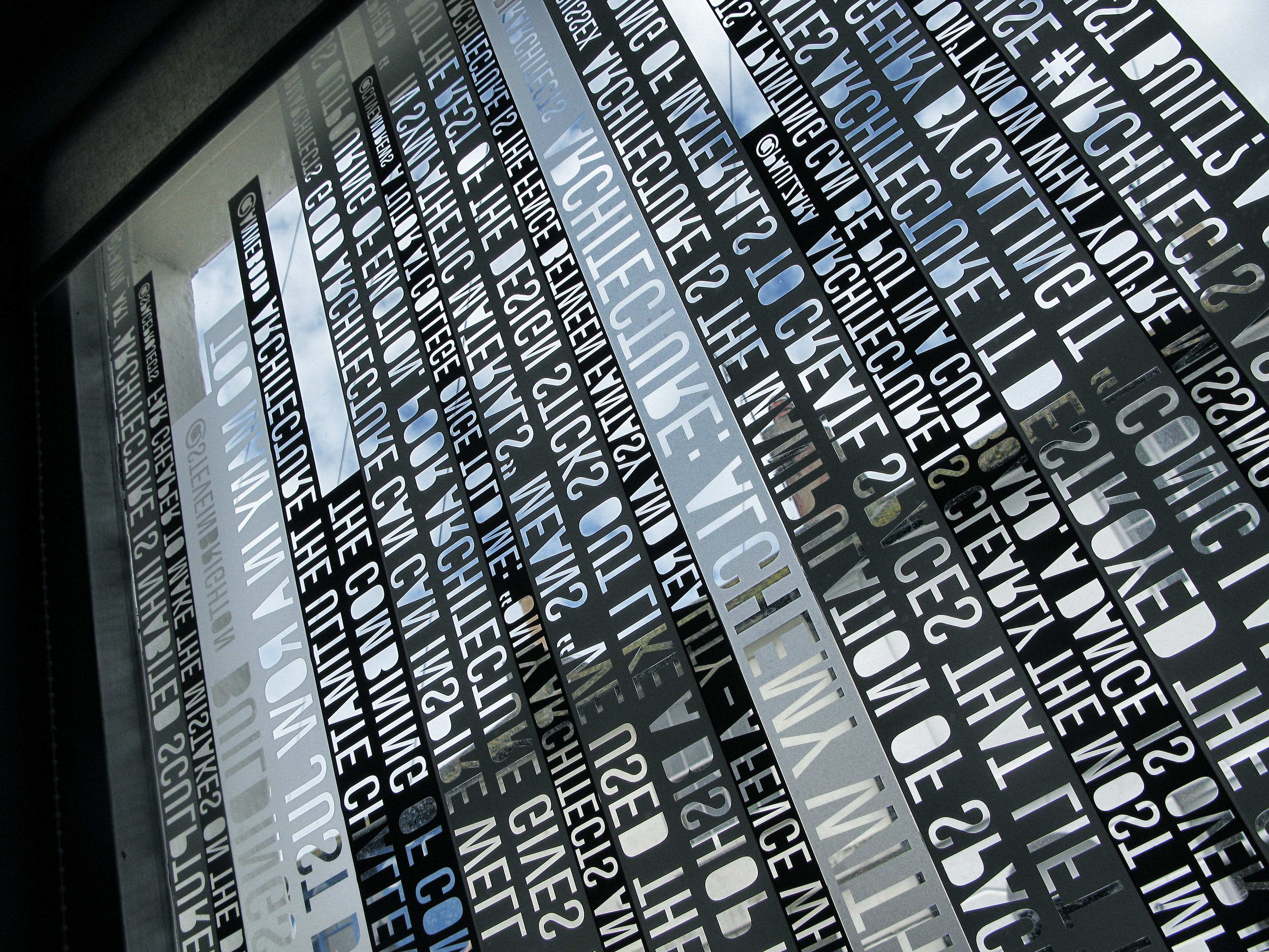 Topographic Tweets invited tweeters to express an opinion, a view, an idea, contentious or otherwise, about architecture, which were designed into a typographic urban landscape. Strips of texts rising up the window in different shades of white, grey and frost give the impression of a skyline where the lettering, absent their counters (spaces in letters), ‘light’ up the architectural form. Fabrication and installation by Nik the Brush.