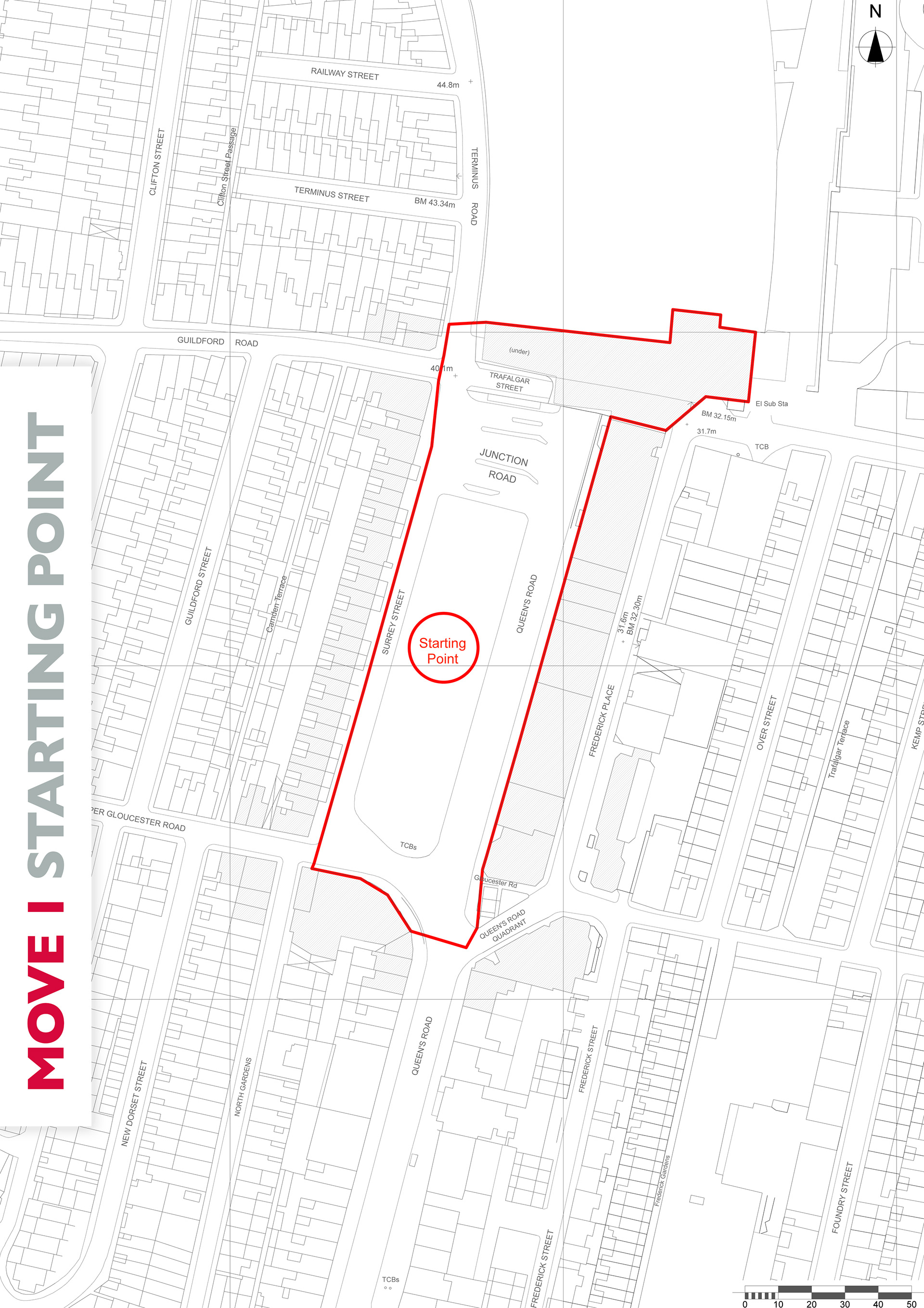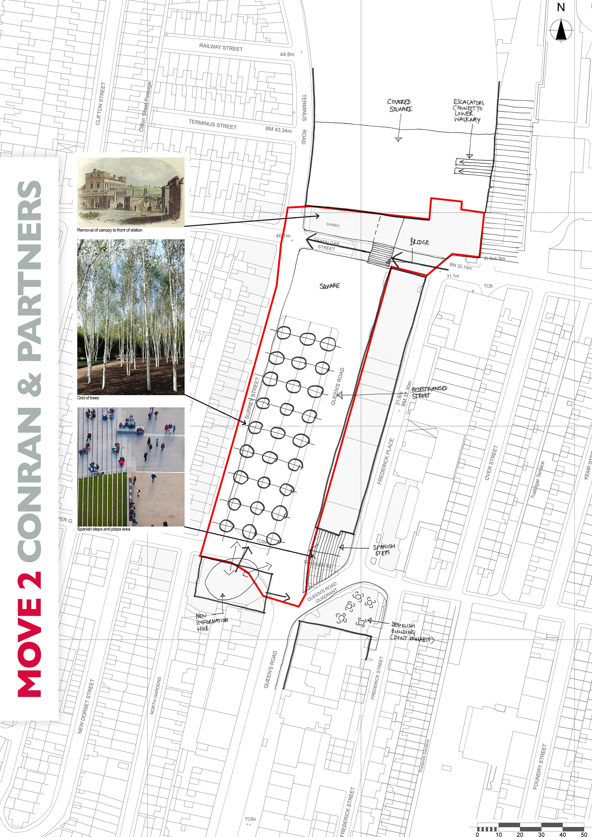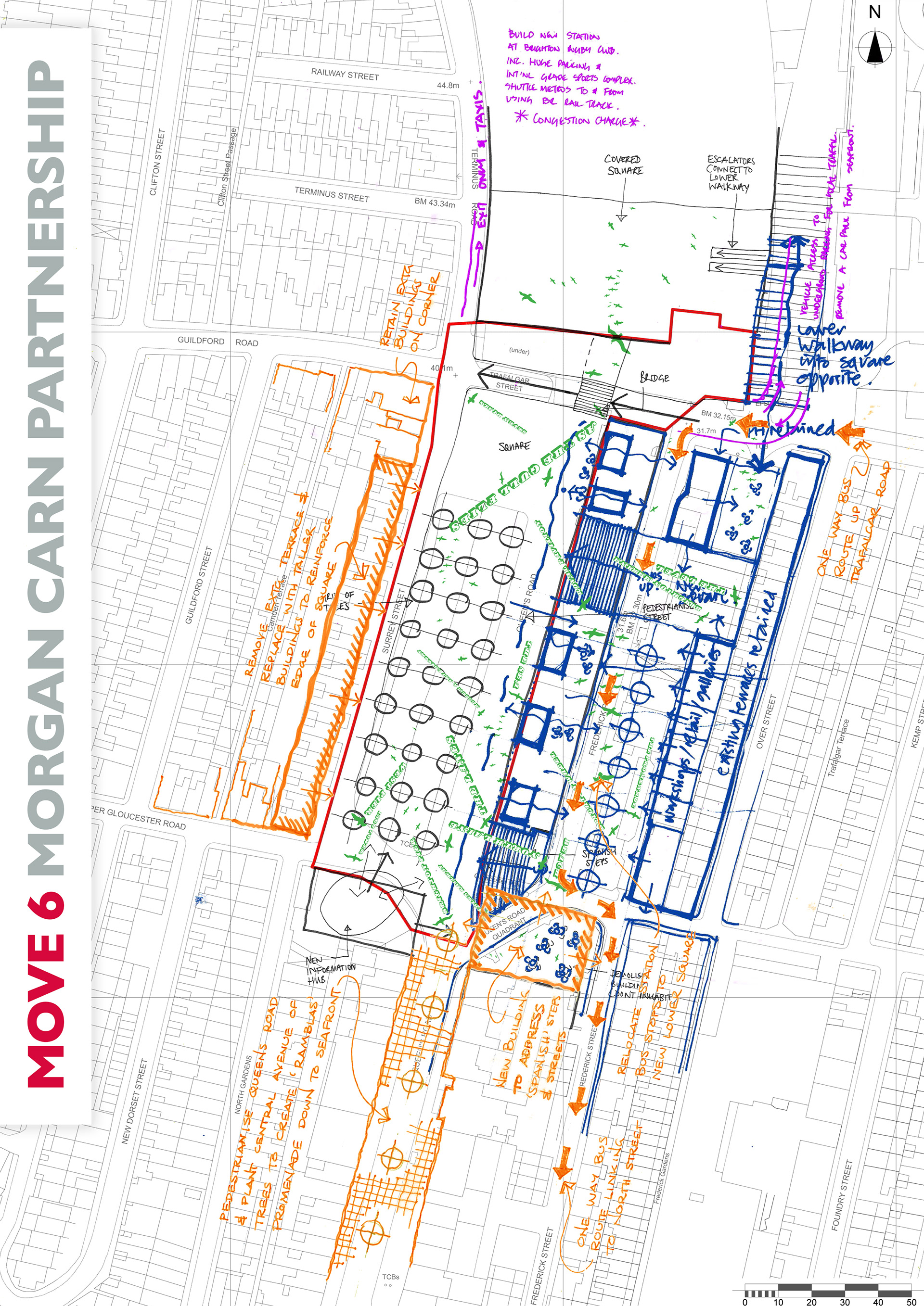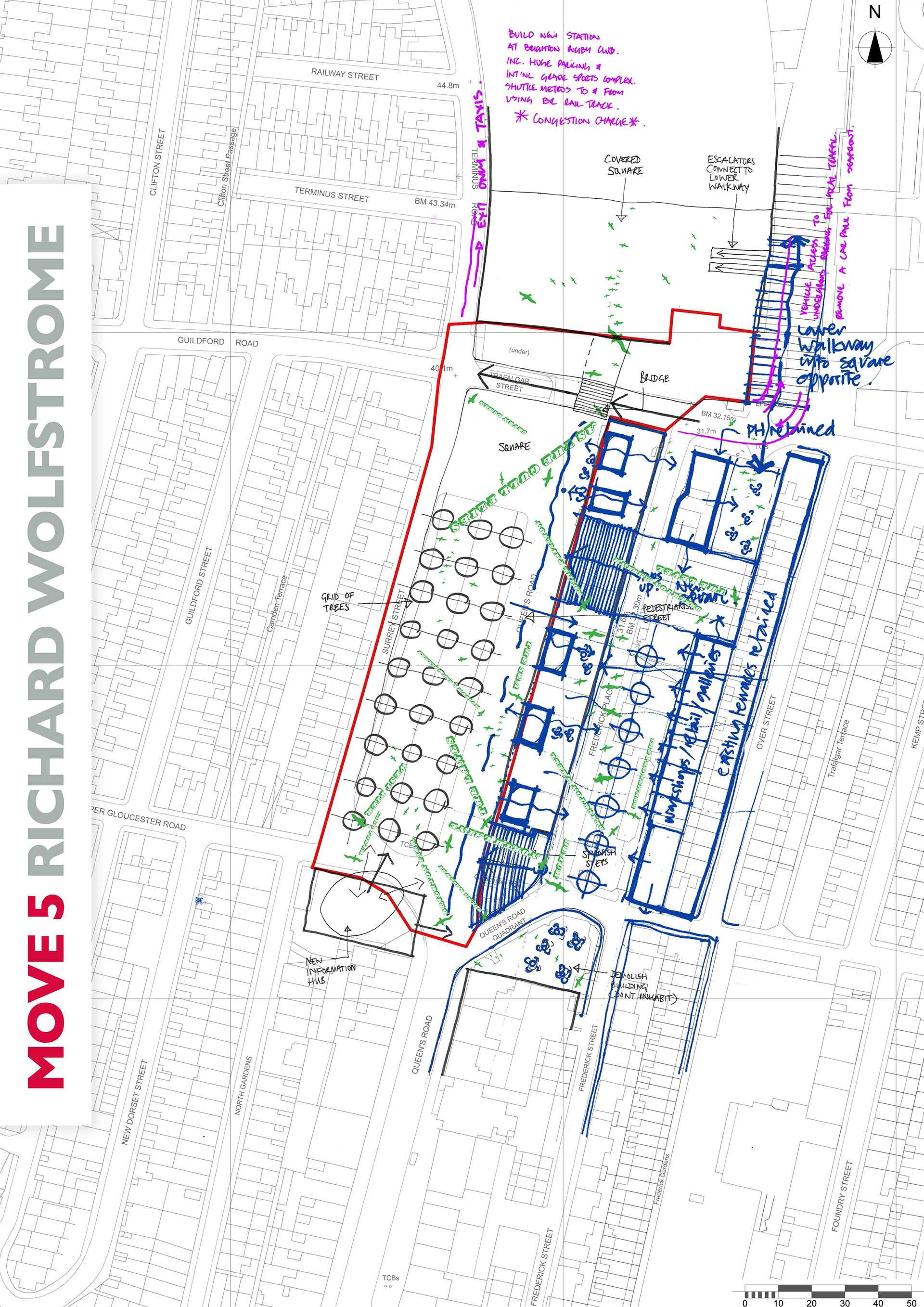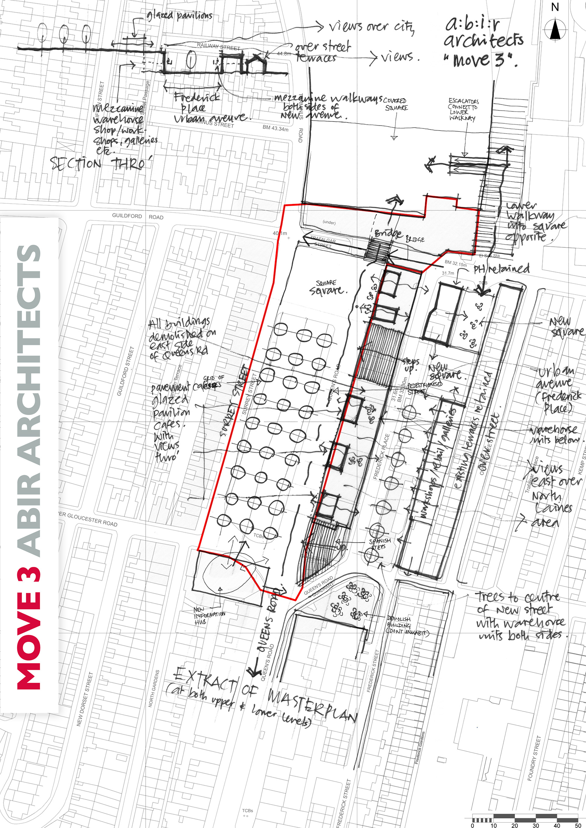 Retaining the majority of the proposal established by Conran in Move 2 outside the station with bridge, new square and pedestrianised Queens Road with a grid of trees, ABIR architects have chosen to inhabit the city block to the south-east of the station connecting the upper Queens Road level and lower Frederick Place level, thus creating a vertical connection across the site and beyond. We acknowledge that connections south to the seafront and north to the New England Quarter and beyond are fundamental and we hope would form a revitalised connection south. However the introduction of a secondary focus east-west is also of considerable importance and will create an urban pedestrian block linking to the upper Queens Road proposal that occupies and inhabits adjacent to the main route from the station to the seafront.