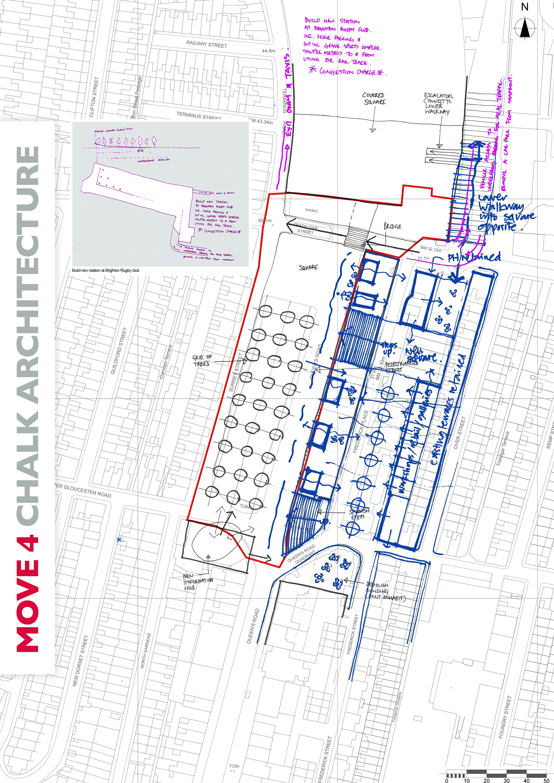 The first move of the game has been to remove the existing buildings on the island site that is bounded by the station to the north, Queen’s road to the east and Surrey Street to the west. This leaves a void in the urban fabric. An invitation to react to the opportunity to change the ‘gateway’ to Brighton and present a vision of the kind of city we should aspire to live in. The participant is free to choose whether to fill the void, enhance it, leave it untouched… in fact almost anything.