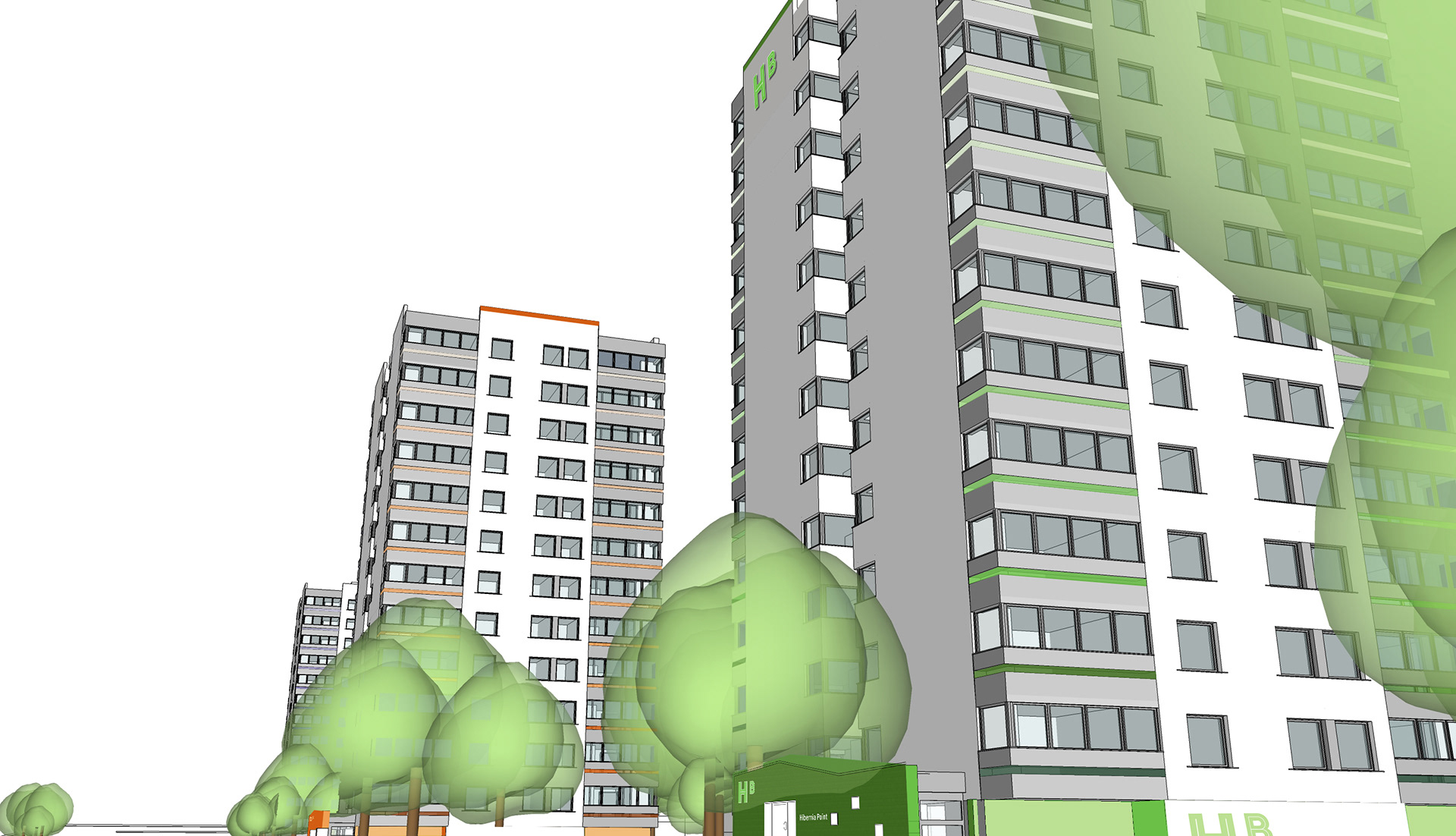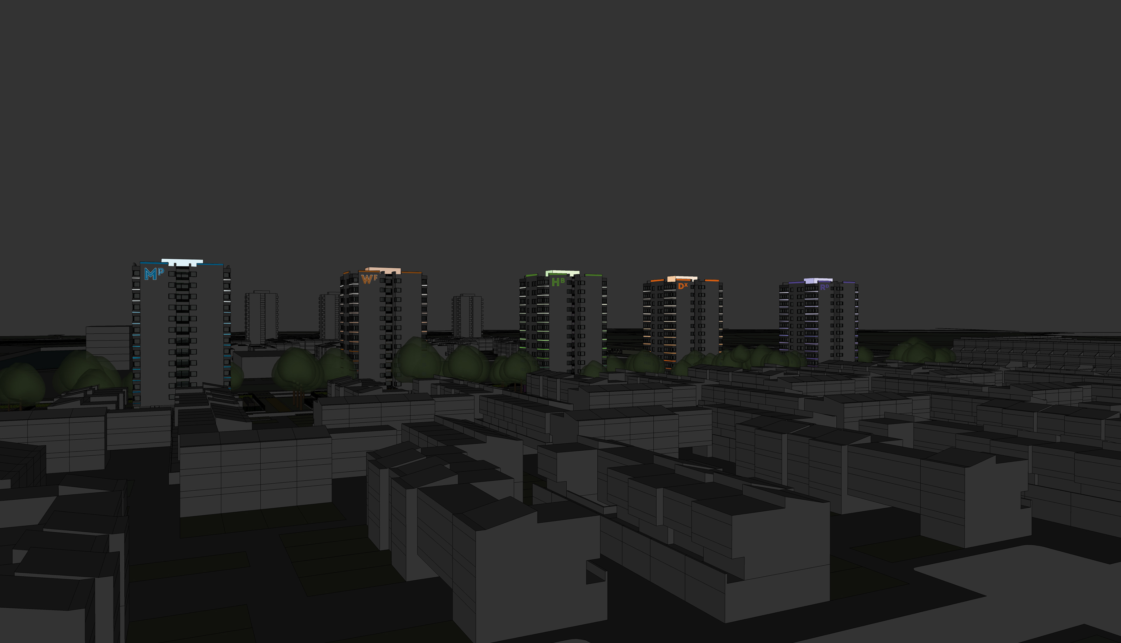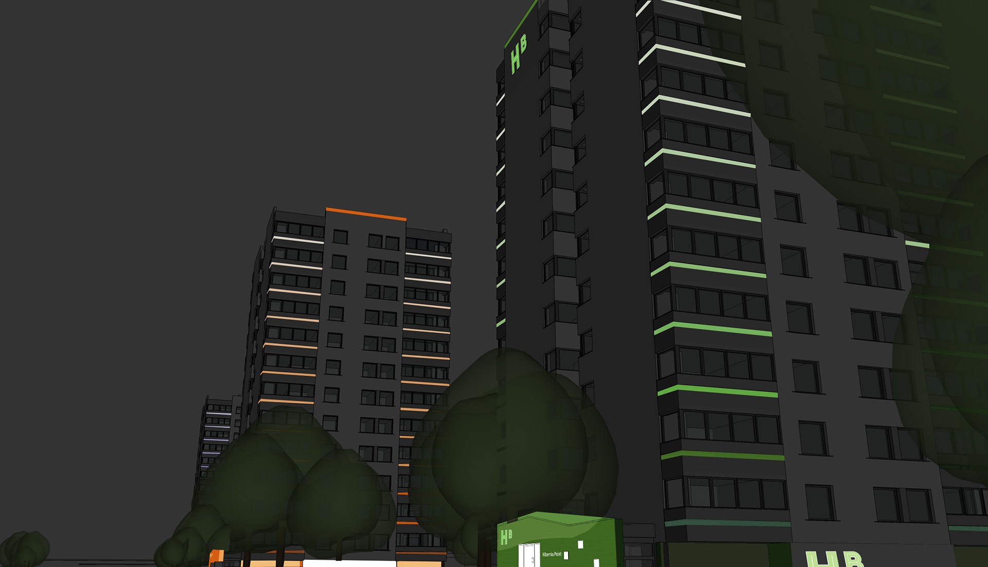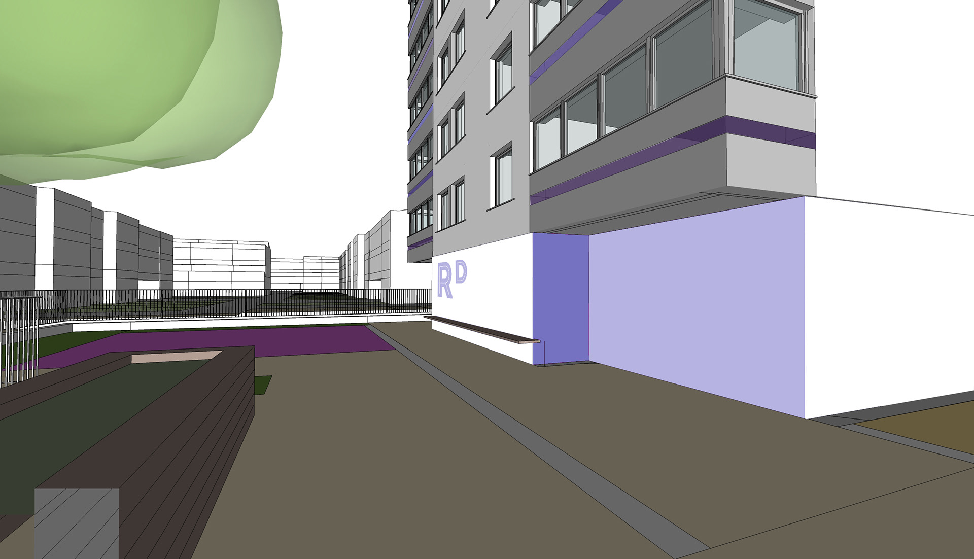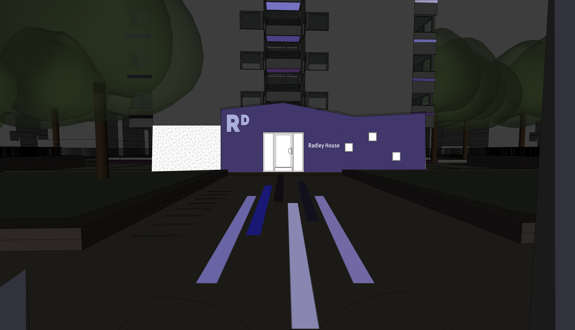 Each building would be designated a key colour which would become recognised as its ‘own’ – Radley House could be identified with the colour purple for example. A complementary palette of colours would be developed to support the buildings key ID colour. This palette of colours would be used on each building in an elegant way to make each tower distinct.