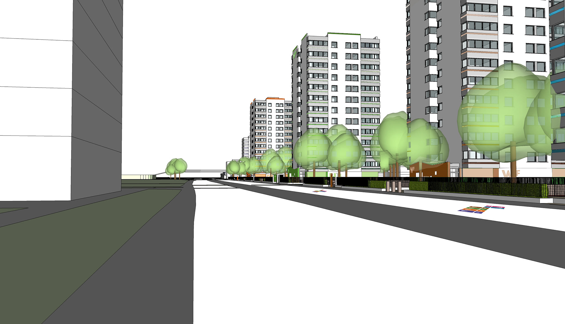 Each entrance (front and back) would also be a ‘marker’ to identify each building – using the key colour across the facia rendered in a textural material (ceramic tiles for example). The ground floor exterior walls will use lighter hues from the palette on designated walls only (other walls following tower colour scheme of white and grey) to create a light approach and drawing the eye to the darker entrance for pedestrian clarity.