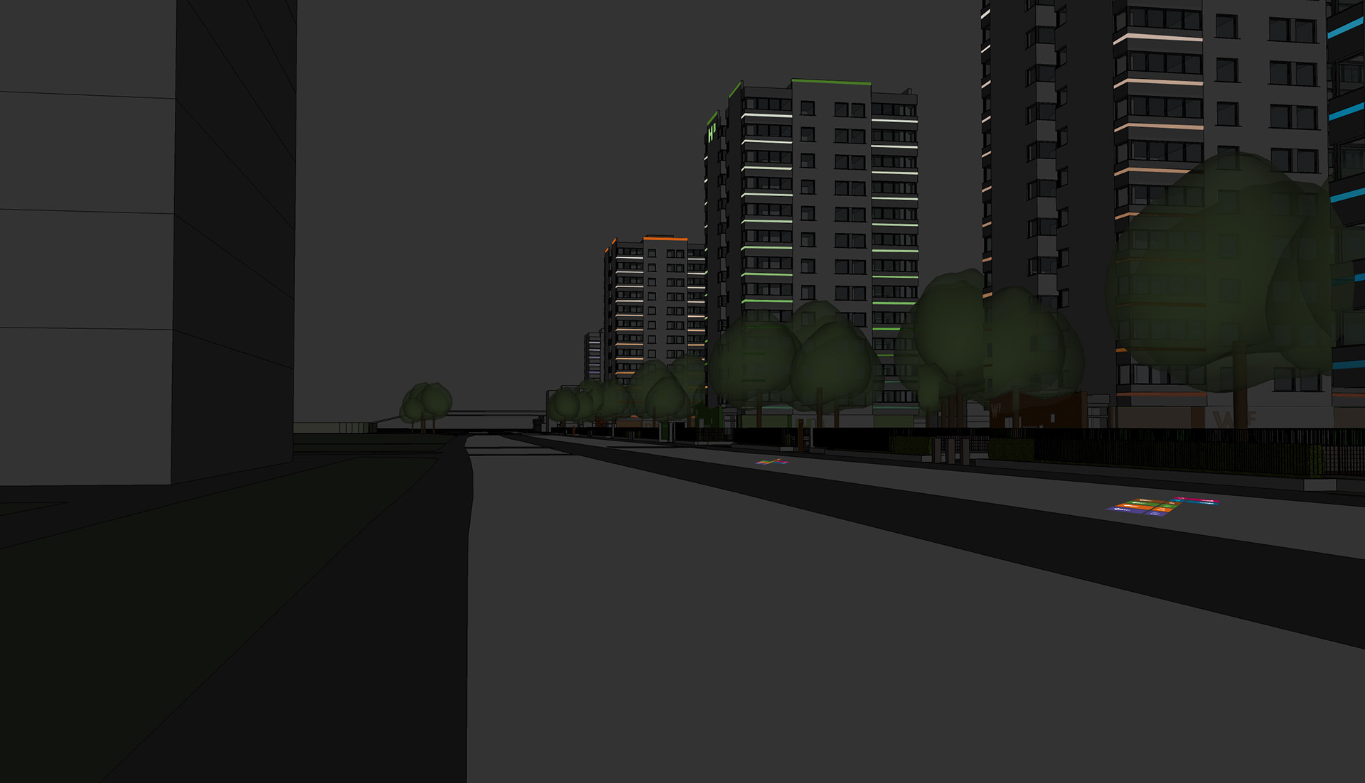 The design follows-through for the community balconies on the front and back of the buildings where the balcony soffits would be painted in the same colours and hues as the residential balcony insets. These would also be gently and simply lit at night to create a similar effect. Further to these features the proposal suggests lighting the top of the building with a thin band of light in the key colour along with illuminating the lift housing to ‘finish’ and define the building roof.